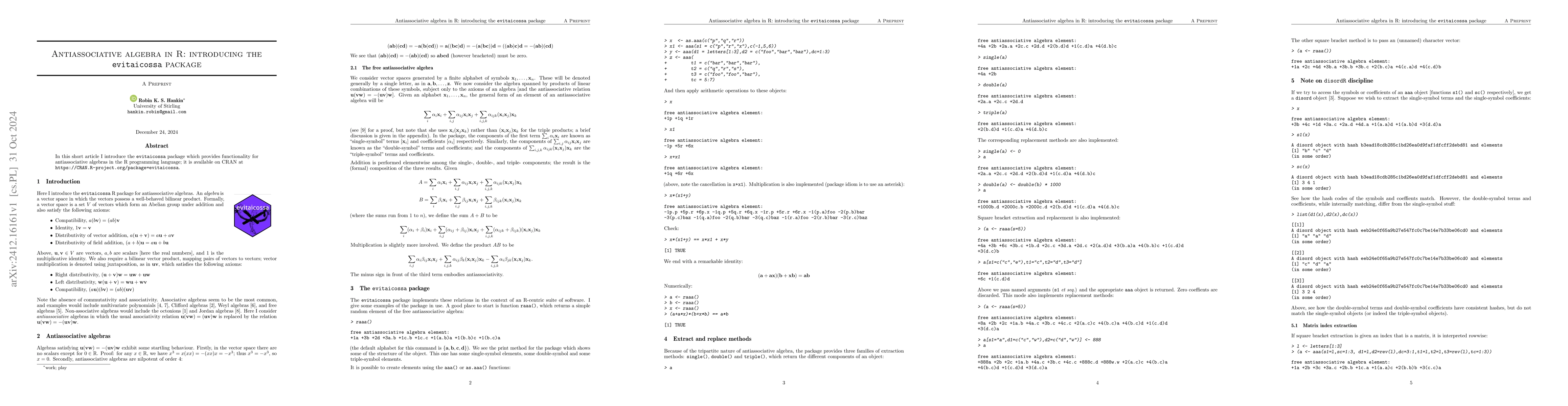 Summary: The evitaicossa package for R introduces tools for working with antiassociative algebras, facilitating computations and analyses in this mathematical domain, available on CRAN.