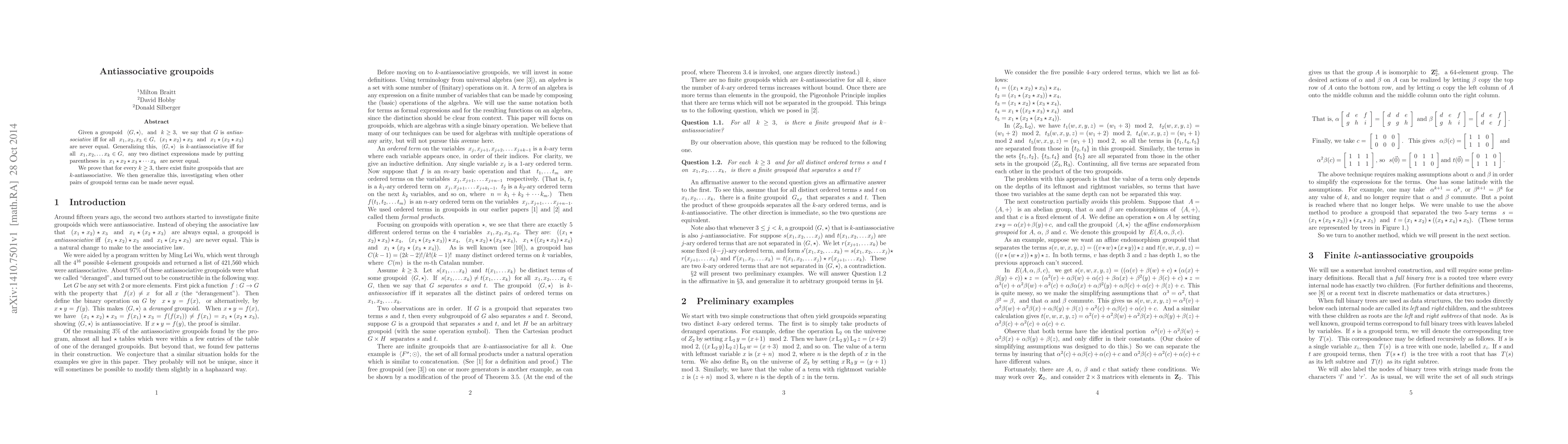 Researchers prove that for every k >= 3, there exist finite groupoids that are k-antiassociative, meaning certain expressions involving the groupoid's operation cannot be made equal.
