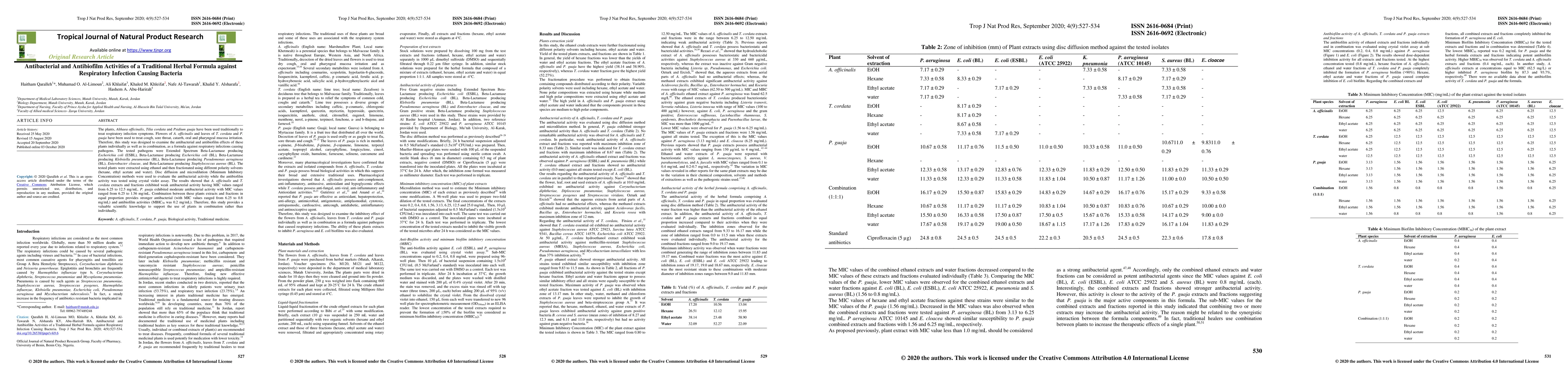 This study investigates the antibacterial and antibiofilm effects of traditional herbal plants—Althaea officinalis, Tilia cordata, and Psidium guaja—against respiratory infection-causing bacteria. The combined extracts showed stronger antibacterial and antibiofilm activities compared to individual plants, suggesting synergistic benefits of using these plants in combination.