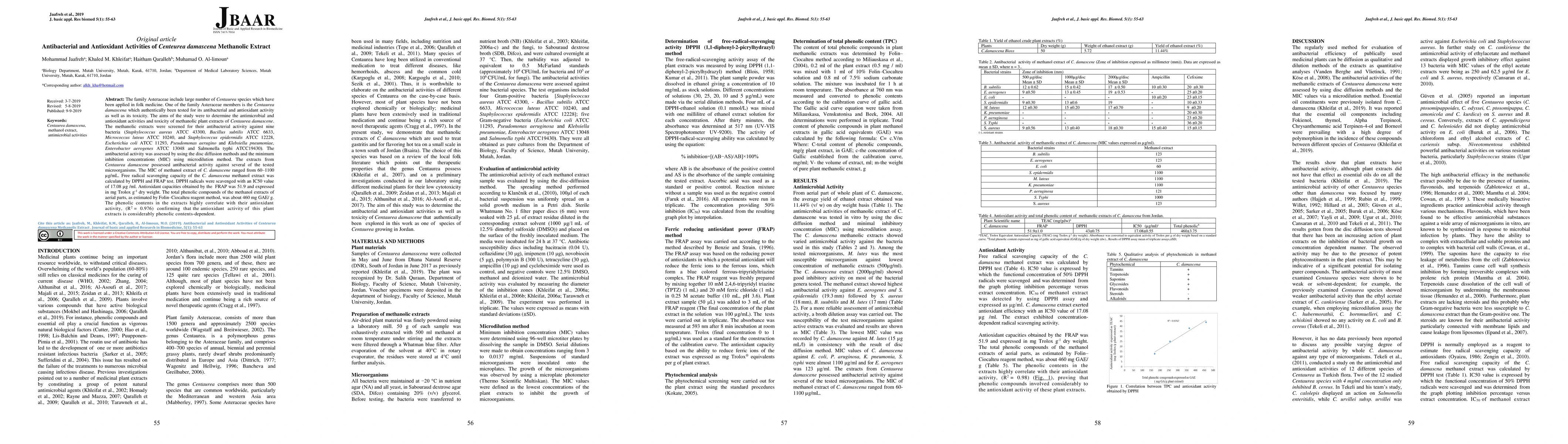 The family Asteraceae include large number of Centaurea species which have been applied in folk medicine. One of the family Asteraceae members is the Centaurea damascena which authentically been tested for its antibacterial and antioxidant activity as well as its toxicity. The aims of the study were to determine the antimicrobial and antioxidant activities and toxicity of methanolic plant extracts of Centaurea damascena. The methanolic extracts were screened for their antibacterial activity against nine bacteria (Staphylococcus aureus ATCC 43300, Bacillus subtilis ATCC 6633, Micrococcus luteus ATCC 10240, and Staphylococcus epidermidis ATCC 12228, Escherichia coli ATCC 11293, Pseudomonas aerugino and Klebsiella pneumoniae, Enterobacter aerogenes ATCC 13048 and Salmonella typhi ATCC19430). The antibacterial activity was assessed by using the disc diffusion methods and the minimum inhibition concentrations (MIC) using microdilution method. The extracts from Centaurea damascena possessed antibacterial activity against several of the tested microorganisms. The MIC of methanol extract of C. damascena ranged from 60 to 1100 microgram per mL. Free radical scavenging capacity of the C. damascena methanol extract was calculated by DPPH and FRAP test. DPPH radicals were scavenged with an IC50 value of 17.08 microgram per mL. Antioxidant capacities obtained by the FRAP was 51.9 and expressed in mg Trolox per gram dry weight. The total phenolic compounds of the methanol extracts of aerial parts, as estimated by Folin_Ciocalteu reagent method, was about 460 mg GAE per gram. The phenolic contents in the extracts highly correlate with their antioxidant activity, confirming that the antioxidant activity of this plant extracts is considerably phenolic contents-dependent.
