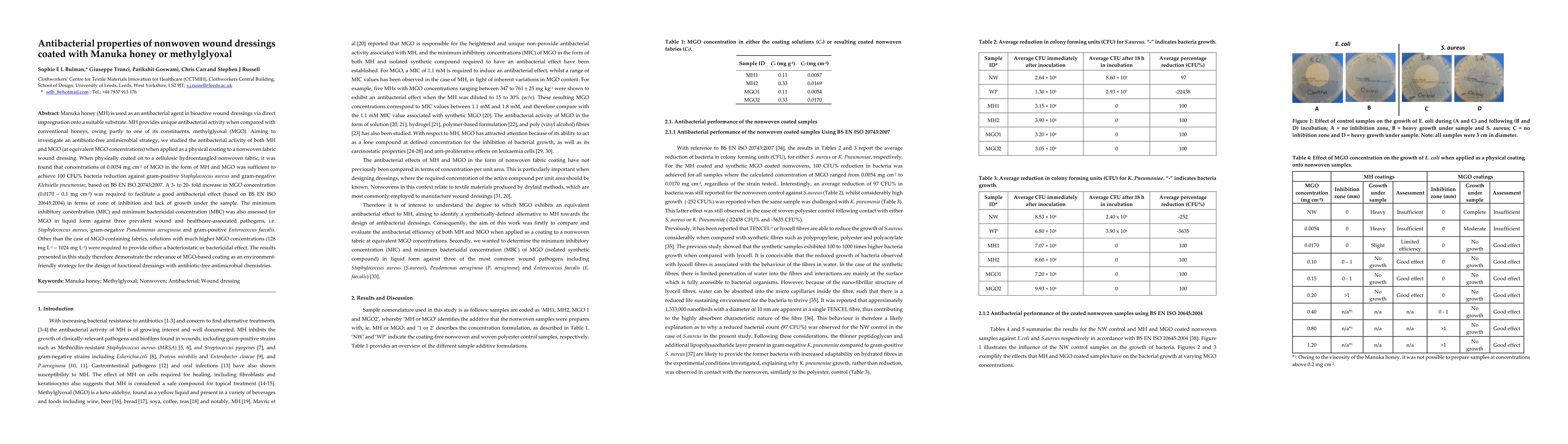 This research investigates the antibacterial efficacy of Manuka honey and its component methylglyoxal (MGO) when coated on nonwoven wound dressings. It finds that MGO coatings, even at low concentrations, effectively reduce bacteria like Staphylococcus aureus and Klebsiella pneumoniae. MGO in liquid form requires higher concentrations for antibacterial action. The study suggests MGO-based coating as a green, antibiotic-free approach for functional wound dressings.