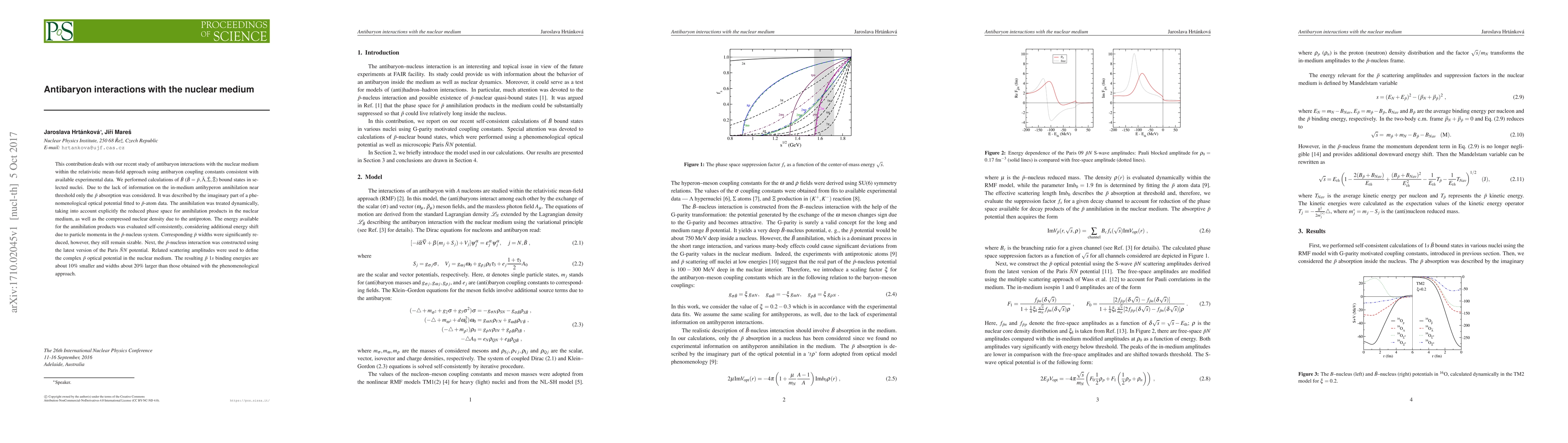 This contribution deals with our recent study of antibaryon interactions with the nuclear medium within the relativistic mean-field approach using antibaryon coupling constants consistent with available experimental data. We performed calculations of $\bar{B}$ ($\bar{B}=\bar{p}, \bar{\Lambda}, \bar{\Sigma}, \bar{\Xi}$) bound states in selected nuclei. Due to the lack of information on the in-medium antihyperon annihilation near threshold only the $\bar{p}$ absorption was considered. It was described by the imaginary part of a phenomenological optical potential fitted to $\bar{p}$-atom data. The annihilation was treated dynamically, taking into account explicitly the reduced phase space for annihilation products in the nuclear medium, as well as the compressed nuclear density due to the antiproton. The energy available for the annihilation products was evaluated self-consistently, considering additional energy shift due to particle momenta in the ${\bar p}$-nucleus system. Corresponding $\bar{p}$ widths were significantly reduced, however, they still remain sizable. Next, the $\bar{p}$-nucleus interaction was constructed using the latest version of the Paris $\bar{N}N$ potential. Related scattering amplitudes were used to define the complex $\bar{p}$ optical potential in the nuclear medium. The resulting $\bar{p}$ $1s$ binding energies are about 10% smaller and widths about 20% larger than those obtained with the phenomenological approach.