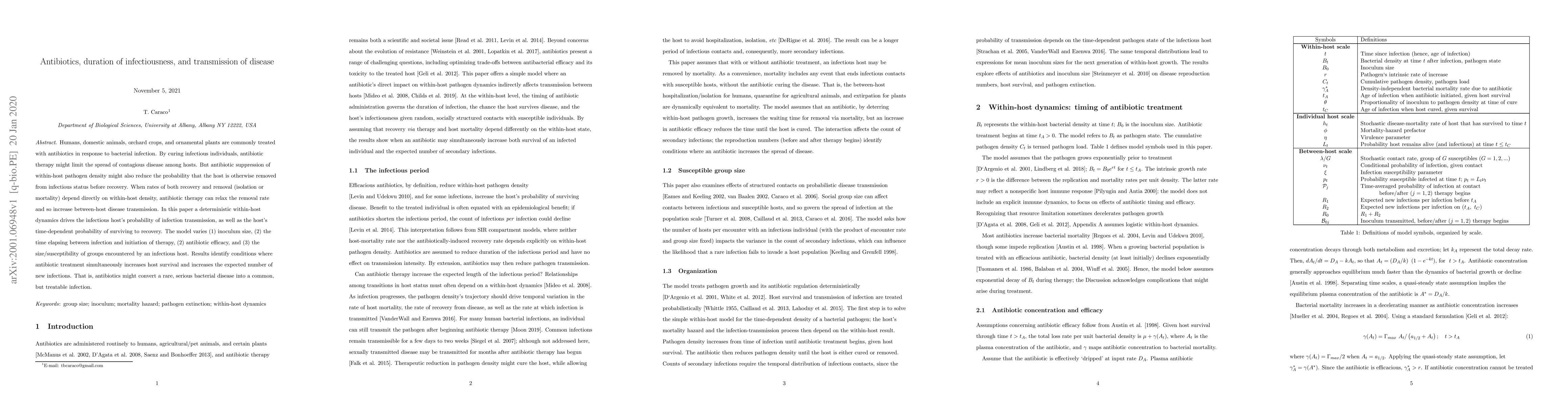 Humans, domestic animals, orchard crops, and ornamental plants are commonly treated with antibiotics in response to bacterial infection. By curing infectious individuals, antibiotic therapy might limit the spread of contagious disease among hosts. But antibiotic suppression of within-host pathogen density might also reduce the probability that the host is otherwise removed from infectious status before recovery. When rates of both recovery and removal (isolation or mortality) depend directly on within-host density, antibiotic therapy can relax the removal rate and so increase between-host disease transmission. In this paper a deterministic within-host dynamics drives the infectious host's probability of infection transmission, as well as the host's time-dependent probability of surviving to recovery. The model varies (1) inoculum size, (2) the time elapsing between infection and initiation of therapy, (2) antibiotic efficacy, and (3) the size/susceptibility of groups encountered by an infectious host. Results identify conditions where antibiotic treatment simultaneously increases host survival and increases the expected number of new infections. That is, antibiotics might convert a rare, serious bacterial disease into a common, but treatable infection.