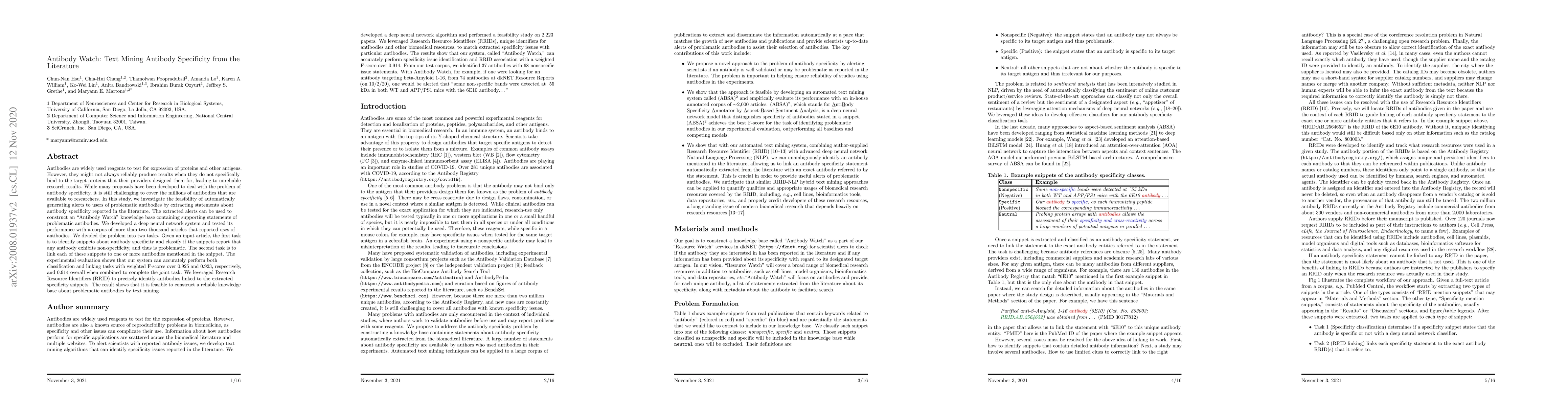 Antibodies are widely used reagents to test for expression of proteins and other antigens. However, they might not always reliably produce results when they do not specifically bind to the target proteins that their providers designed them for, leading to unreliable research results. While many proposals have been developed to deal with the problem of antibody specificity, it is still challenging to cover the millions of antibodies that are available to researchers. In this study, we investigate the feasibility of automatically generating alerts to users of problematic antibodies by extracting statements about antibody specificity reported in the literature. The extracted alerts can be used to construct an "Antibody Watch" knowledge base containing supporting statements of problematic antibodies. We developed a deep neural network system and tested its performance with a corpus of more than two thousand articles that reported uses of antibodies. We divided the problem into two tasks. Given an input article, the first task is to identify snippets about antibody specificity and classify if the snippets report that any antibody exhibits non-specificity, and thus is problematic. The second task is to link each of these snippets to one or more antibodies mentioned in the snippet. The experimental evaluation shows that our system can accurately perform both classification and linking tasks with weighted F-scores over 0.925 and 0.923, respectively, and 0.914 overall when combined to complete the joint task. We leveraged Research Resource Identifiers (RRID) to precisely identify antibodies linked to the extracted specificity snippets. The result shows that it is feasible to construct a reliable knowledge base about problematic antibodies by text mining.