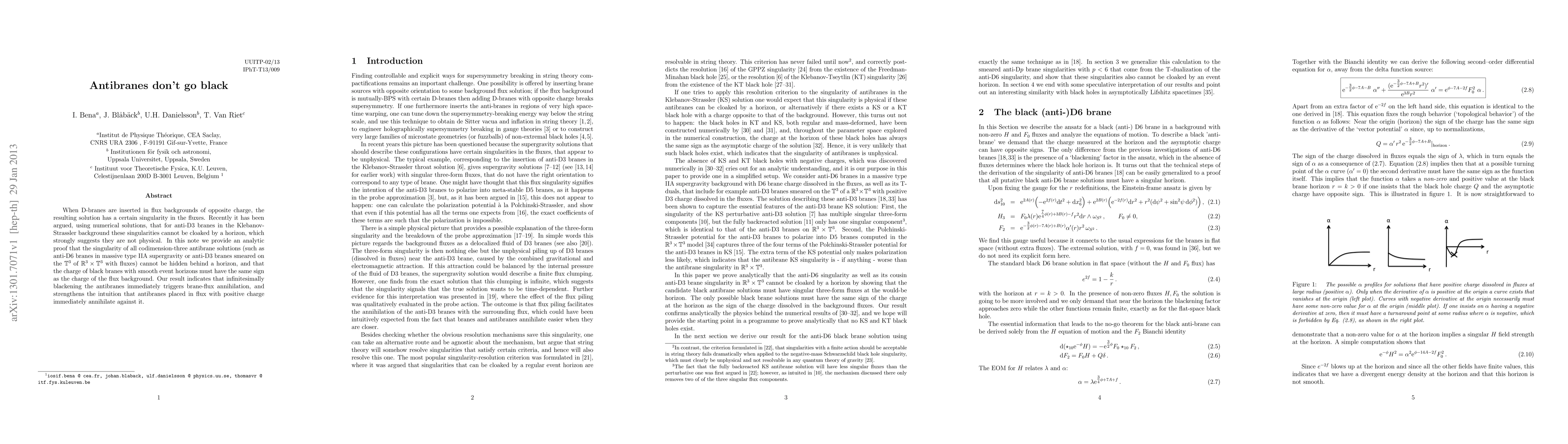 When D-branes are inserted in flux backgrounds of opposite charge, the resulting solution has a certain singularity in the fluxes. Recently it has been argued, using numerical solutions, that for anti-D3 branes in the Klebanov-Strassler background these singularities cannot be cloaked by a horizon, which strongly suggests they are not physical. In this note we provide an analytic proof that the singularity of all codimension-three antibrane solutions (such as anti-D6 branes in massive type IIA supergravity or anti-D3 branes smeared on the T^3 of R^3xT^3 with fluxes) cannot be hidden behind a horizon, and that the charge of black branes with smooth event horizons must have the same sign as the charge of the flux background. Our result indicates that infinitesimally blackening the antibranes immediately triggers brane-flux annihilation, and strengthens the intuition that antibranes placed in flux with positive charge immediately annihilate against it.