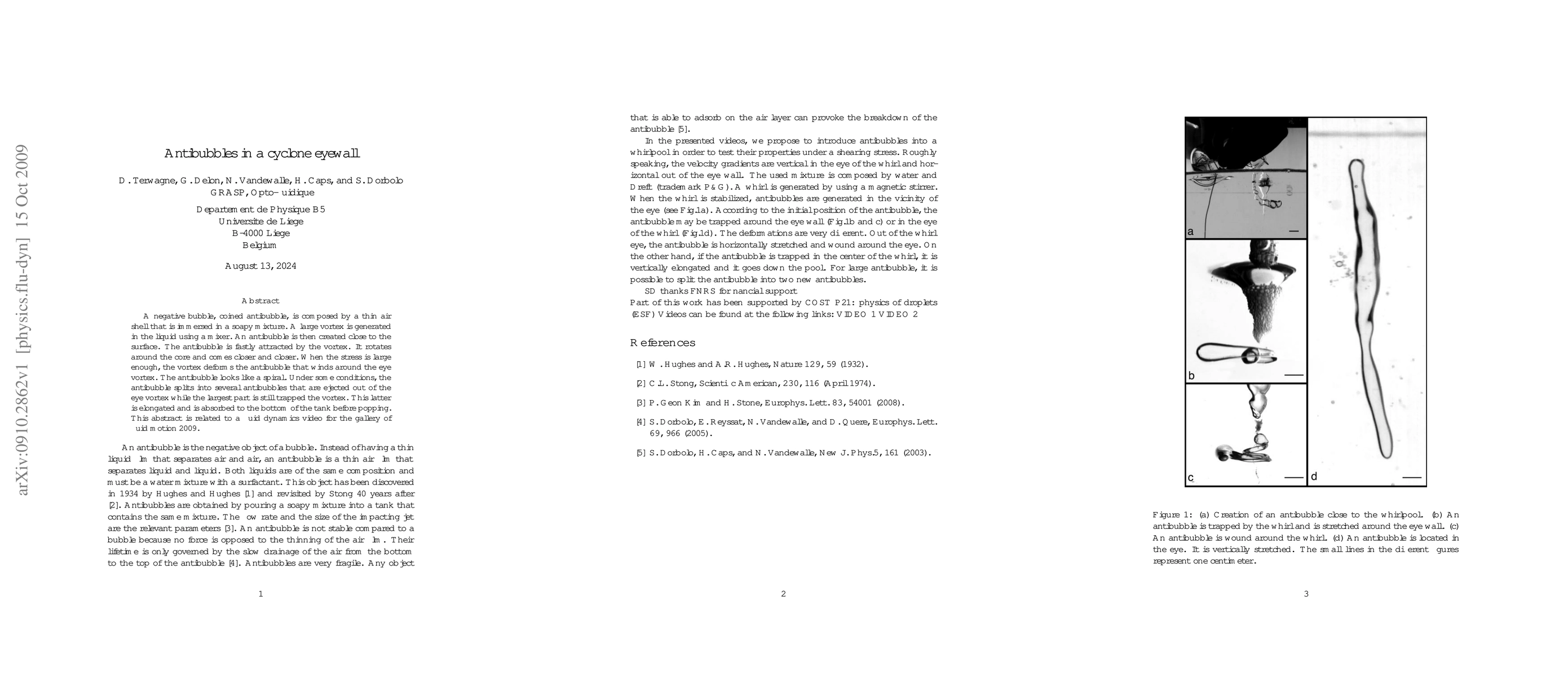 A negative bubble, coined antibubble, is composed by a thin air shell that is immersed in a soapy mixture. A large vortex is generated in the liquid using a mixer. An antibubble is then created close to the surface. The antibubble is fastly attracted by the vortex. It rotates arount the core and comes closer and closer. When the stress is large enough, the vortex deforms the antibubble that winds around the eye vortex. The antibubble looks like a spiral. Under some conditions, the antibubble splits into several antibubbles that are ejected out of the eye vortex while the largest part is still trapped the vortex. This latter is elongated and is absorbed to the bottom of the tank before popping. fluid dynamics video