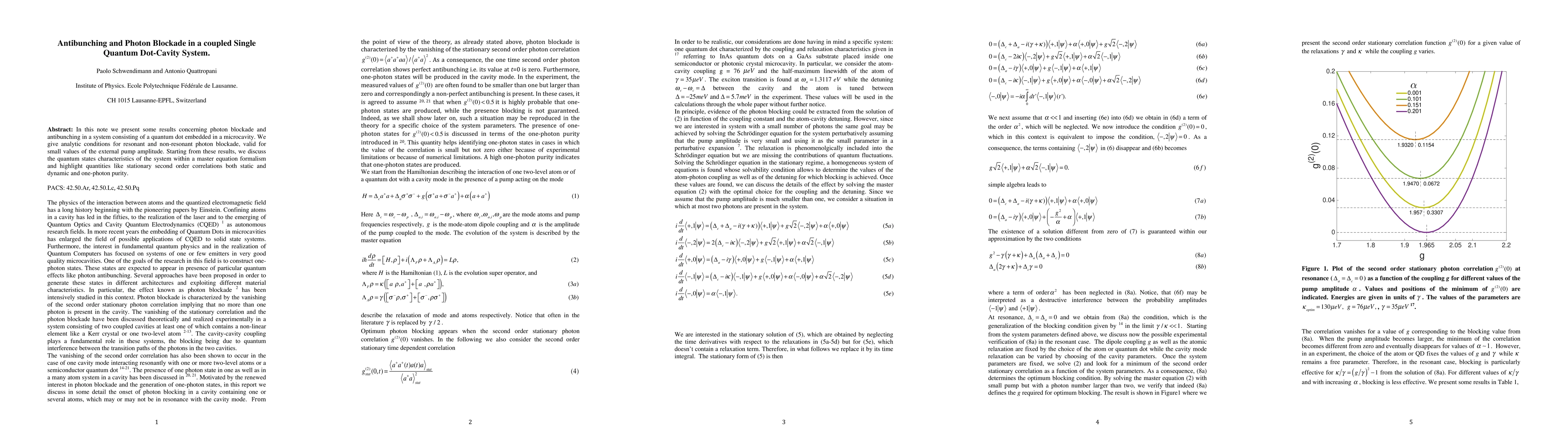 This paper investigates photon blockade and antibunching in a quantum dot-cavity system, providing analytic conditions for both resonant and non-resonant photon blockade under small pump amplitudes. It also explores the quantum states' characteristics using a master equation formalism, focusing on second-order correlations and one-photon purity.