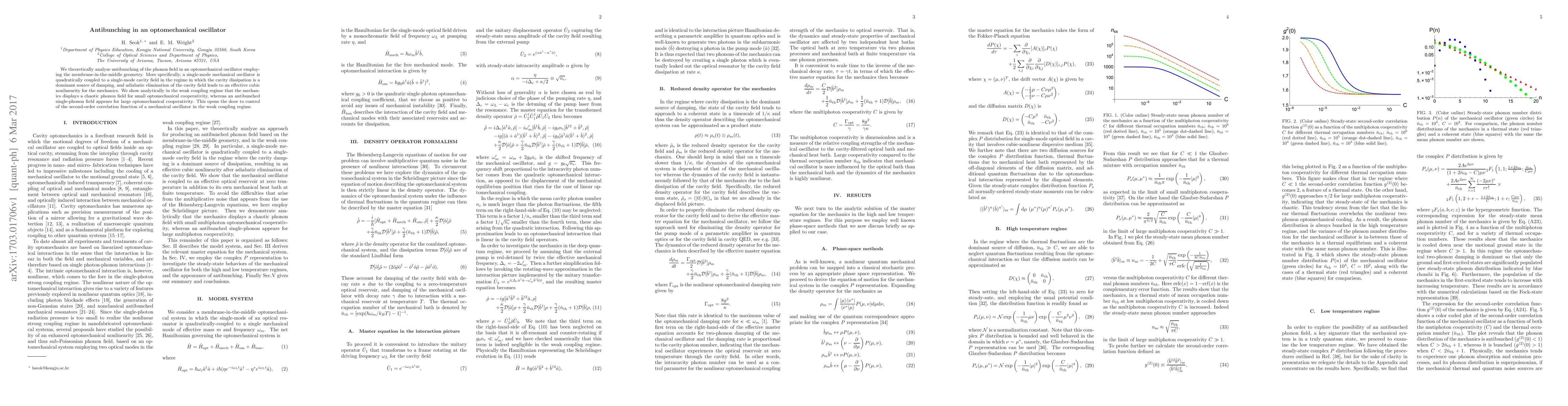 This paper theoretically investigates antibunching of phonons in an optomechanical oscillator using a membrane-in-the-middle geometry. For large optomechanical cooperativity, it demonstrates the emergence of an antibunched single-phonon field, revealing control over the second-order correlation function in the weak coupling regime.