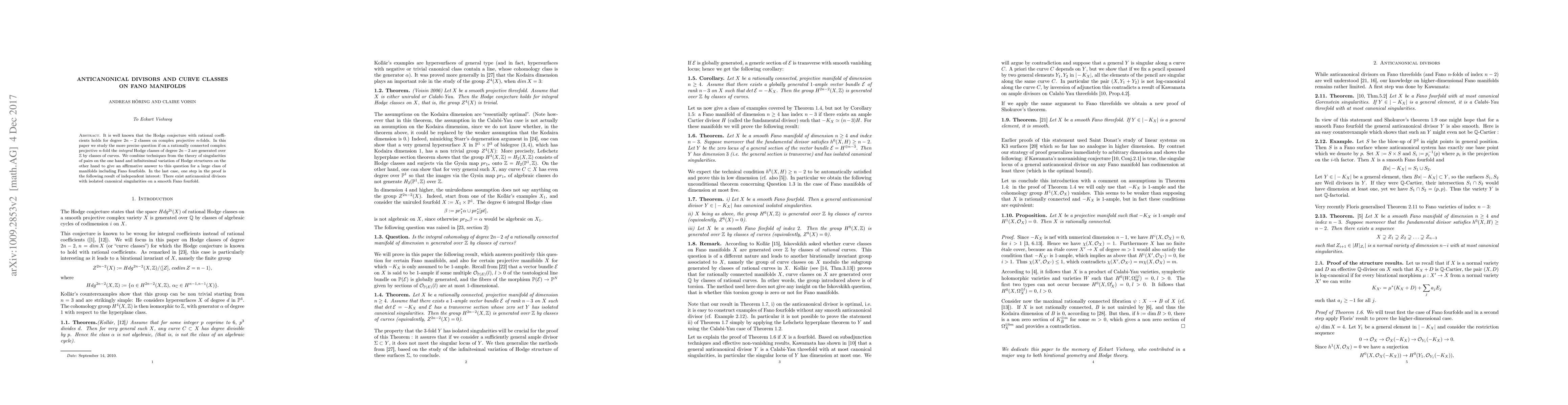 This paper confirms that on rationally connected complex projective n-folds, integral Hodge classes of degree 2n-2 are generated by classes of curves, using techniques from pair singularities and infinitesimal Hodge structure variations. Notably, it establishes the existence of anticanonical divisors with isolated canonical singularities on smooth Fano fourfolds.