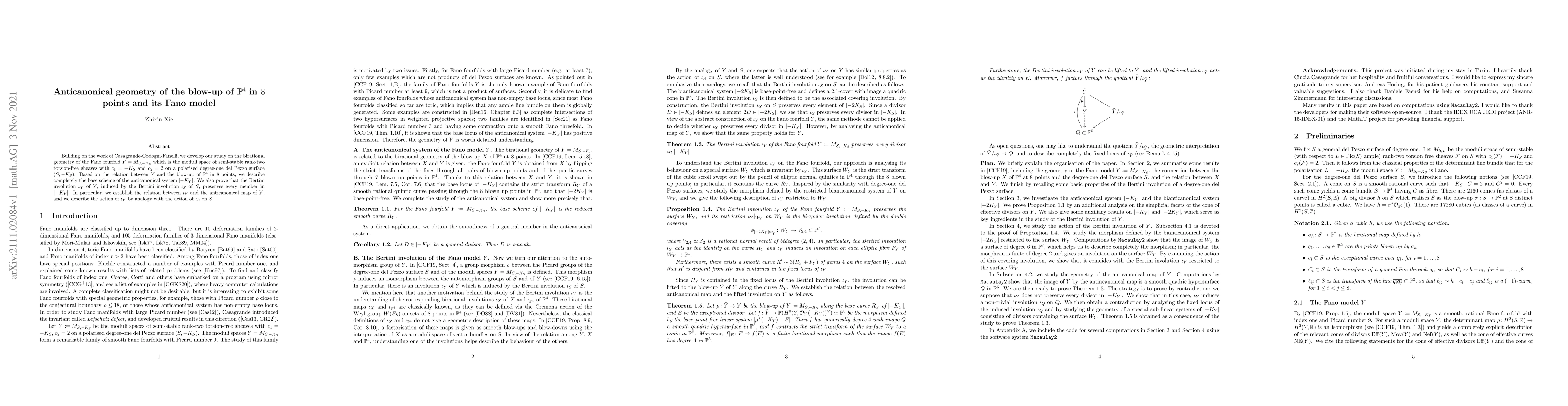 This paper explores the birational geometry of a Fano fourfold $Y$ related to the blow-up of $\mathbb{P}^4$ in 8 points, detailing the base scheme of its anticanonical system $|{-}K_Y|$ and proving the preservation of every member by the Bertini involution $\iota_Y$. It also establishes the relation between $\iota_Y$ and the anticanonical map of $Y$.