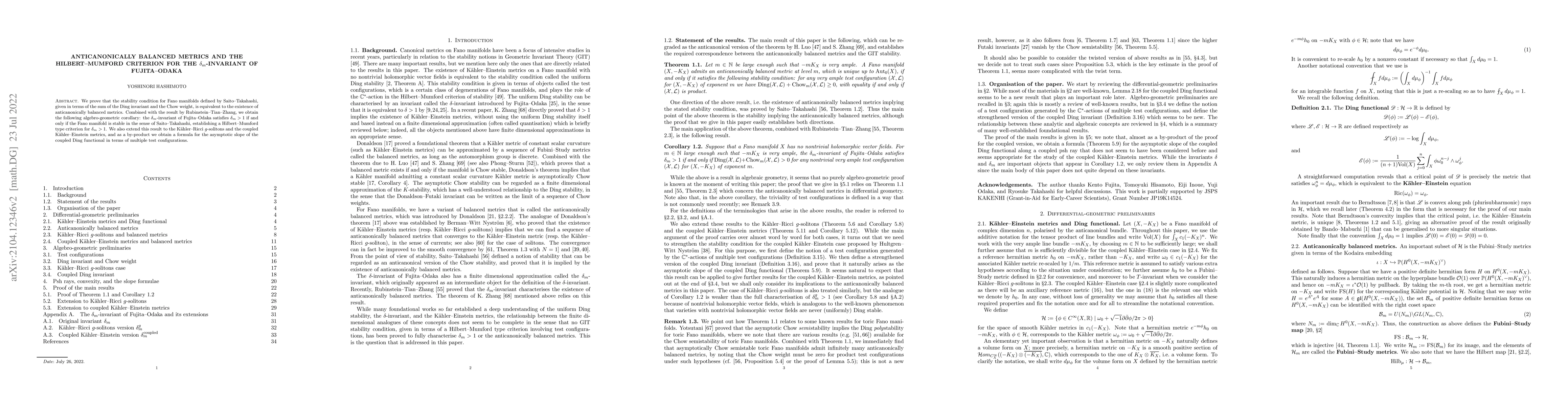 We prove that the stability condition for Fano manifolds defined by Saito-Takahashi, given in terms of the sum of the Ding invariant and the Chow weight, is equivalent to the existence of anticanonically balanced metrics. Combined with the result by Rubinstein-Tian-Zhang, we obtain the following algebro-geometric corollary: the $\delta_m$-invariant of Fujita-Odaka satisfies $\delta_m >1$ if and only if the Fano manifold is stable in the sense of Saito-Takahashi, establishing a Hilbert-Mumford type criterion for $\delta_m >1$. We also extend this result to the K\"ahler-Ricci $g$-solitons and the coupled K\"ahler-Einstein metrics, and as a by-product we obtain a formula for the asymptotic slope of the coupled Ding functional in terms of multiple test configurations.