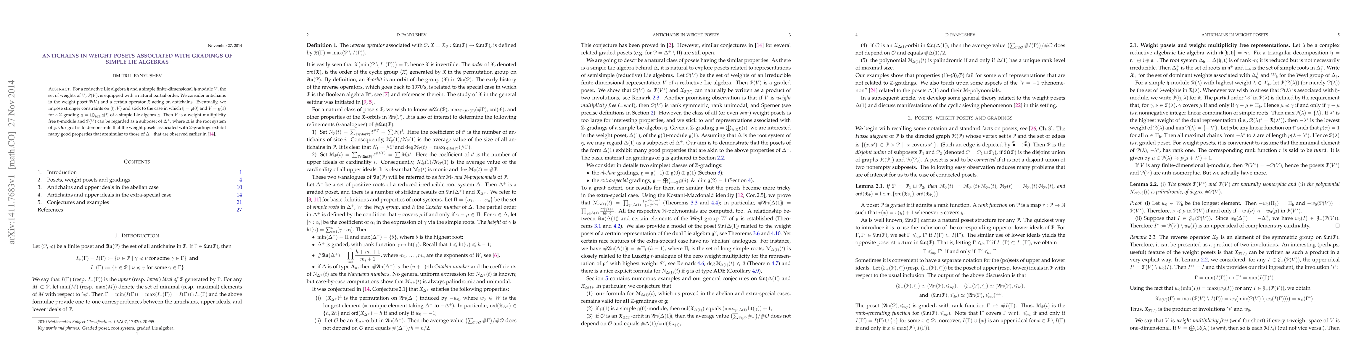 For a reductive Lie algebra $\mathfrak h$ and a simple finite-dimensional $\mathfrak h$-module $V$, the set of weights of $V$, $P(V)$, has a natural poset structure. We consider antichains in the weight poset $P(V)$ and a certain operator $\mathfrak X$ acting on antichains. Eventually, we impose stronger constraints on $(\mathfrak h,V)$ and stick to the case in which $\mathfrak h$ and $V$ are associated with a $Z$-grading of a simple Lie algebra $\mathfrak g$. Then $V$ is a weight multiplicity free $\mathfrak h$-module and $P(V)$ can be regarded as a subposet of $\Delta^+$, where $\Delta$ is the root system of $\mathfrak g$. Our goal is to demonstrate that antichains in the weight posets associated with $Z$-gradings of $\mathfrak g$ exhibit many good properties similar to those of $\Delta^+$ that are observed earlier in arXiv: math.CO 0711.3353 (=Ref. [14] in the text).
