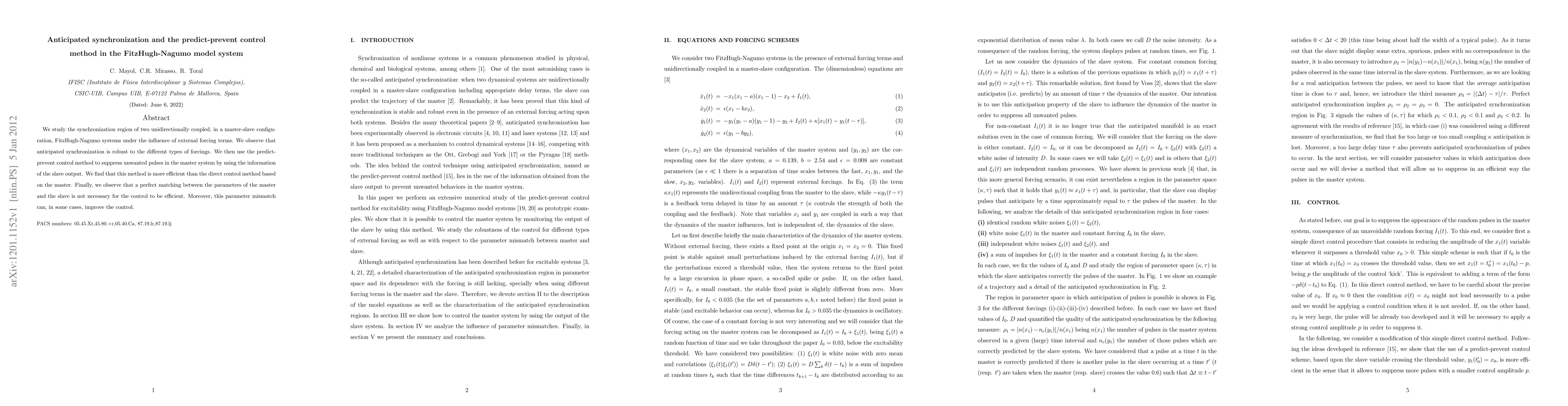 We study the synchronization region of two unidirectionally coupled, in a master-slave configuration, FitzHugh-Nagumo systems under the influence of external forcing terms. We observe that anticipated synchronization is robust to the different types of forcings. We then use the predict-prevent control method to suppress unwanted pulses in the master system by using the information of the slave output. We find that this method is more efficient than the direct control method based on the master. Finally, we observe that a perfect matching between the parameters of the master and the slave is not necessary for the control to be efficient. Moreover, this parameter mismatch can, in some cases, improve the control.
