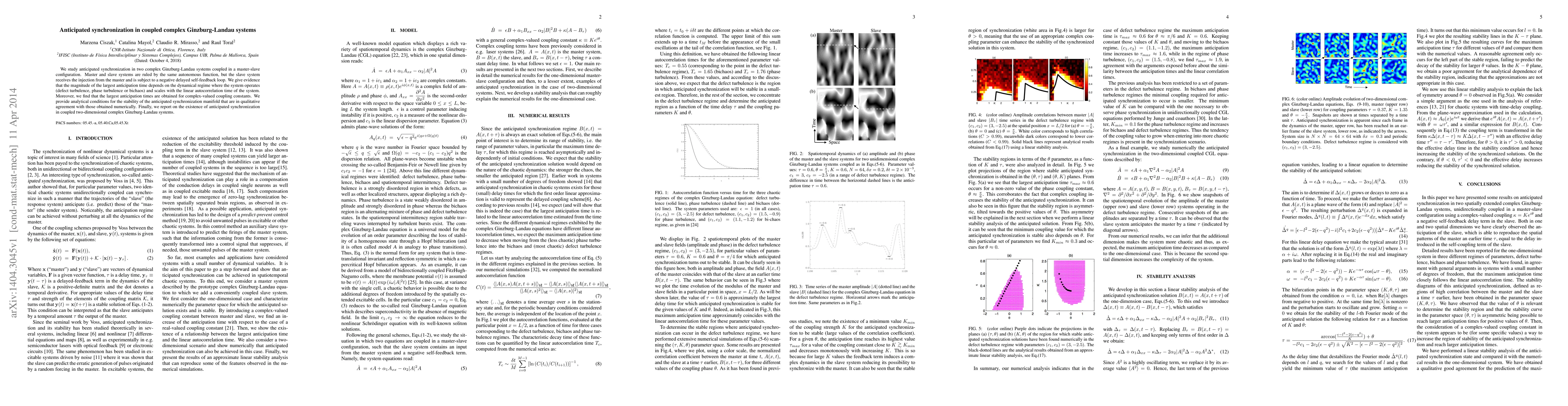 This research investigates anticipated synchronization in coupled complex Ginzburg-Landau systems, showing that the largest anticipation time depends on the system's dynamical regime and scales with its linear autocorrelation time. The study also finds anticipated synchronization occurs with complex-valued coupling constants and provides analytical stability conditions that match numerical results.