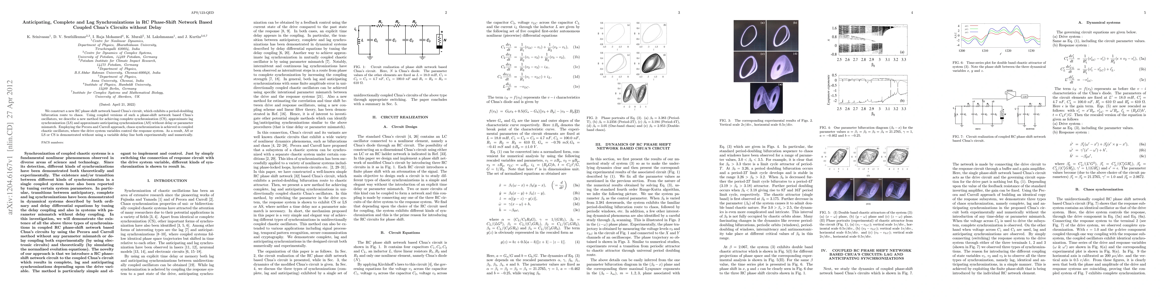 This paper introduces a new RC phase-shift network-based Chua's circuit that follows a period-doubling route to chaos. It presents a method for achieving complete, lag, and anticipating synchronization in coupled versions of these circuits without delay or parameter mismatch, validated through both numerical and experimental approaches.