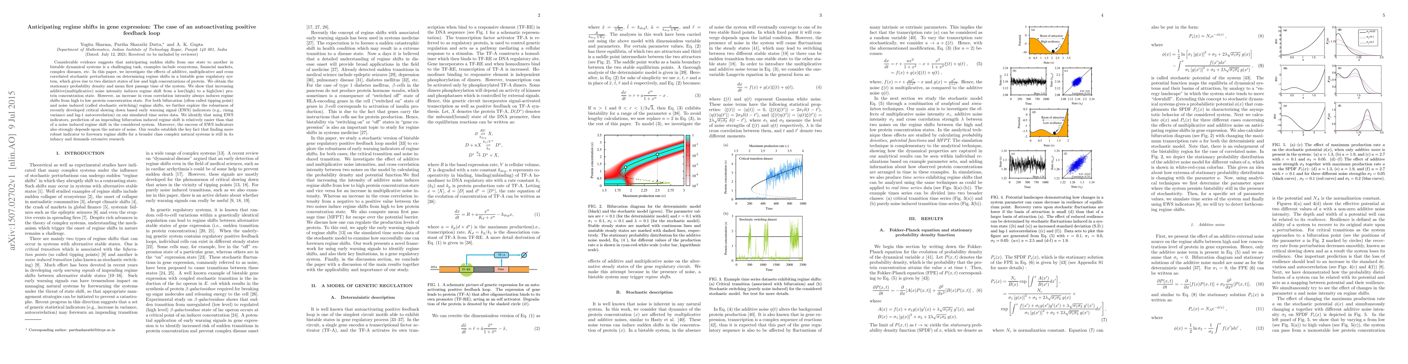 Considerable evidence suggests that anticipating sudden shifts from one state to another in bistable dynamical systems is a challenging task, examples include ecosystems, financial markets, complex diseases, etc. In this paper, we investigate the effects of additive, multiplicative and cross correlated stochastic perturbations on determining regime shifts in a bistable gene regulatory sys- tem, which gives rise to two distinct states of low and high concentrations of protein. We obtain the stationary probability density and mean first passage time of the system. We show that increasing additive(multiplicative) noise intensity induces regime shift from a low(high) to a high(low) pro- tein concentration state. However, an increase in cross correlation intensity always induces regime shifts from high to low protein concentration state. For both bifurcation (often called tipping point) and noise induced (called stochastic switching) regime shifts, we further explore the robustness of recently developed critical slowing down based early warning signal (EWS) indicators (e.g., rising variance and lag-1 autocorrelation) on our simulated time series data. We identify that using EWS indicators, prediction of an impending bifurcation induced regime shift is relatively easier than that of a noise induced regime shift in the considered system. Moreover, the success of EWS indicators also strongly depends upon the nature of noise. Our results establish the key fact that finding more robust indicator to forewarn regime shifts for a broader class complex natural systems is still in its infancy and demands extensive research.
