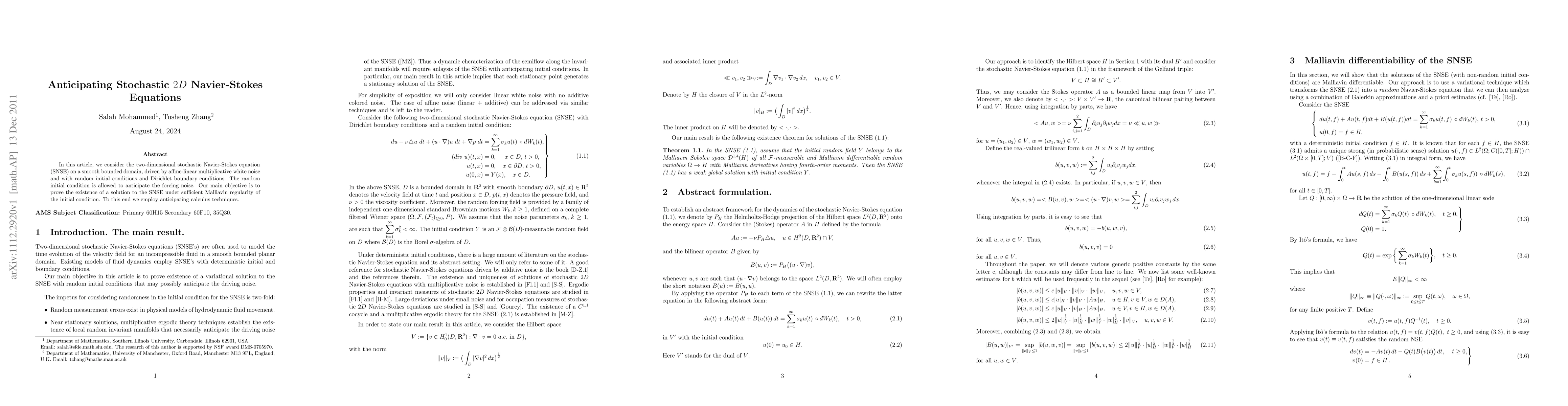 In this article, we consider the two-dimensional stochastic Navier-Stokes equation (SNSE) on a smooth bounded domain, driven by affine-linear multiplicative white noise and with random initial conditions and Dirichlet boundary conditions. The random initial condition is allowed to anticipate the forcing noise. Our main objective is to prove the existence of a solution to the SNSE under sufficient Malliavin regularity of the initial condition. To this end we employ anticipating calculus techniques.