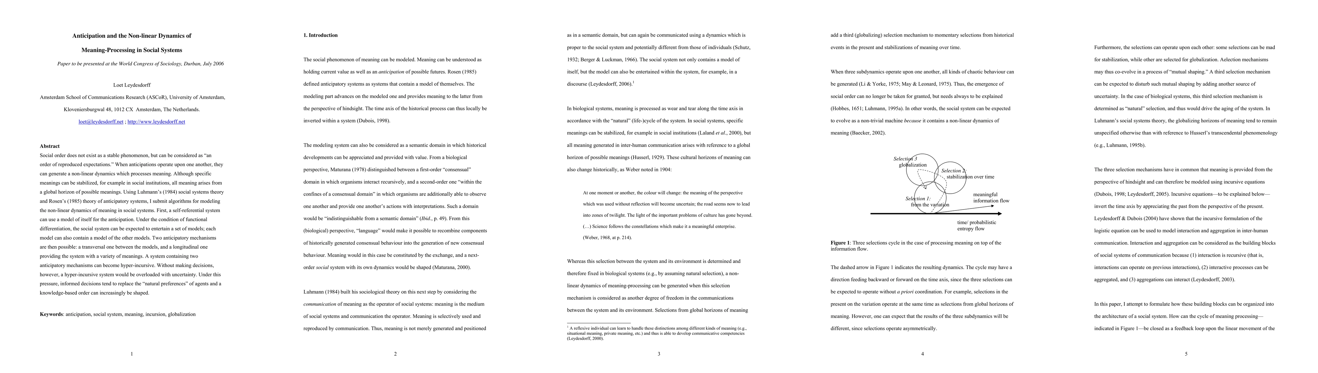 Social order does not exist as a stable phenomenon, but can be considered as "an order of reproduced expectations." When anticipations operate upon one another, they can generate a non-linear dynamics which processes meaning. Although specific meanings can be stabilized, for example in social institutions, all meaning arises from a global horizon of possible meanings. Using Luhmann's (1984) social systems theory and Rosen's (1985) theory of anticipatory systems, I submit algorithms for modeling the non-linear dynamics of meaning in social systems. First, a self-referential system can use a model of itself for the anticipation. Under the condition of functional differentiation, the social system can be expected to entertain a set of models; each model can also contain a model of the other models. Two anticipatory mechanisms are then possible: a transversal one between the models, and a longitudinal one providing the system with a variety of meanings. A system containing two anticipatory mechanisms can become hyper-incursive. Without making decisions, however, a hyper-incursive system would be overloaded with uncertainty. Under this pressure, informed decisions tend to replace the "natural preferences" of agents and a knowledge-based order can increasingly be shaped.