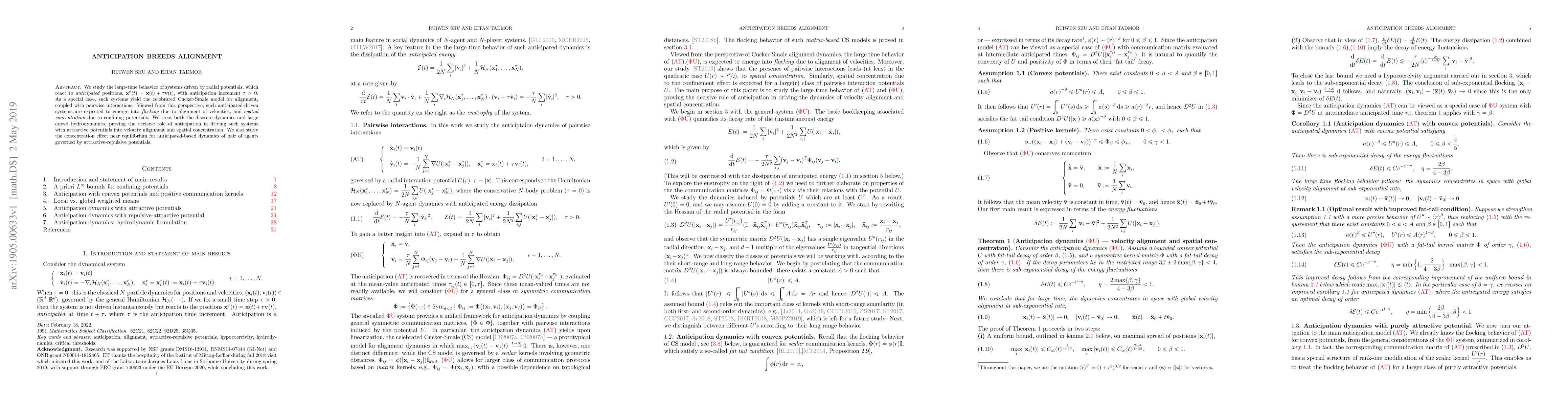 We study the large-time behavior of systems driven by radial potentials, which react to anticipated positions, ${\mathbf x}^\tau(t)={\mathbf x}(t)+\tau {\mathbf v}(t)$, with anticipation increment $\tau>0$. As a special case, such systems yield the celebrated Cucker-Smale model for alignment, coupled with pairwise interactions. Viewed from this perspective, such anticipated-driven systems are expected to emerge into flocking due to alignment of velocities, and spatial concentration due to confining potentials. We treat both the discrete dynamics and large crowd hydrodynamics, proving the decisive role of anticipation in driving such systems with attractive potentials into velocity alignment and spatial concentration. We also study the concentration effect near equilibrium for anticipated-based dynamics of pair of agents governed by attractive-repulsive potentials.