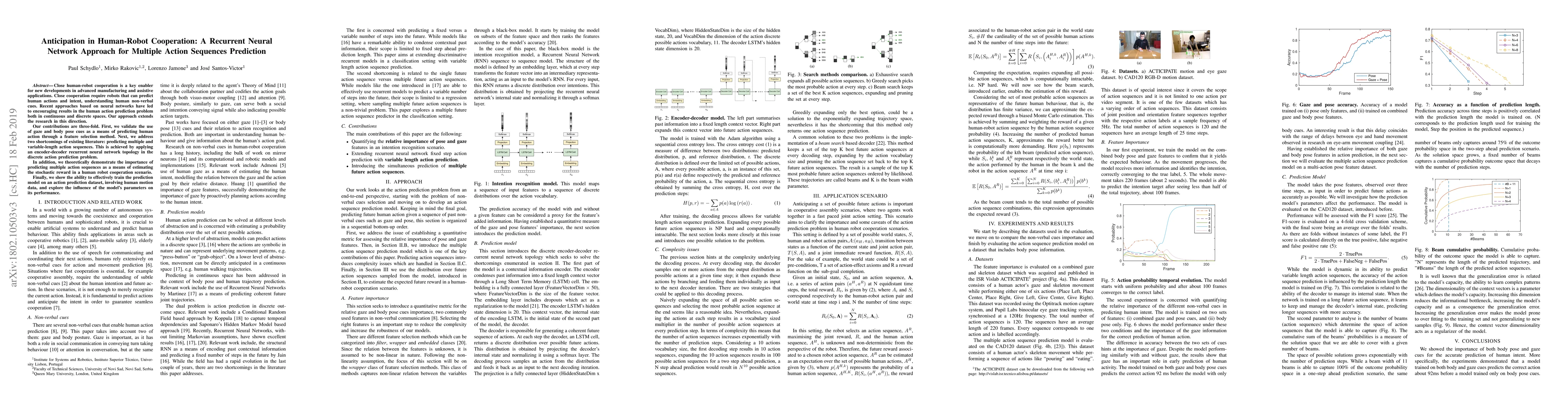 Close human-robot cooperation is a key enabler for new developments in advanced manufacturing and assistive applications. Close cooperation require robots that can predict human actions and intent, and understand human non-verbal cues. Recent approaches based on neural networks have led to encouraging results in the human action prediction problem both in continuous and discrete spaces. Our approach extends the research in this direction. Our contributions are three-fold. First, we validate the use of gaze and body pose cues as a means of predicting human action through a feature selection method. Next, we address two shortcomings of existing literature: predicting multiple and variable-length action sequences. This is achieved by introducing an encoder-decoder recurrent neural network topology in the discrete action prediction problem. In addition, we theoretically demonstrate the importance of predicting multiple action sequences as a means of estimating the stochastic reward in a human robot cooperation scenario. Finally, we show the ability to effectively train the prediction model on a action prediction dataset, involving human motion data, and explore the influence of the model's parameters on its performance. Source code repository: https://github.com/pschydlo/ActionAnticipation