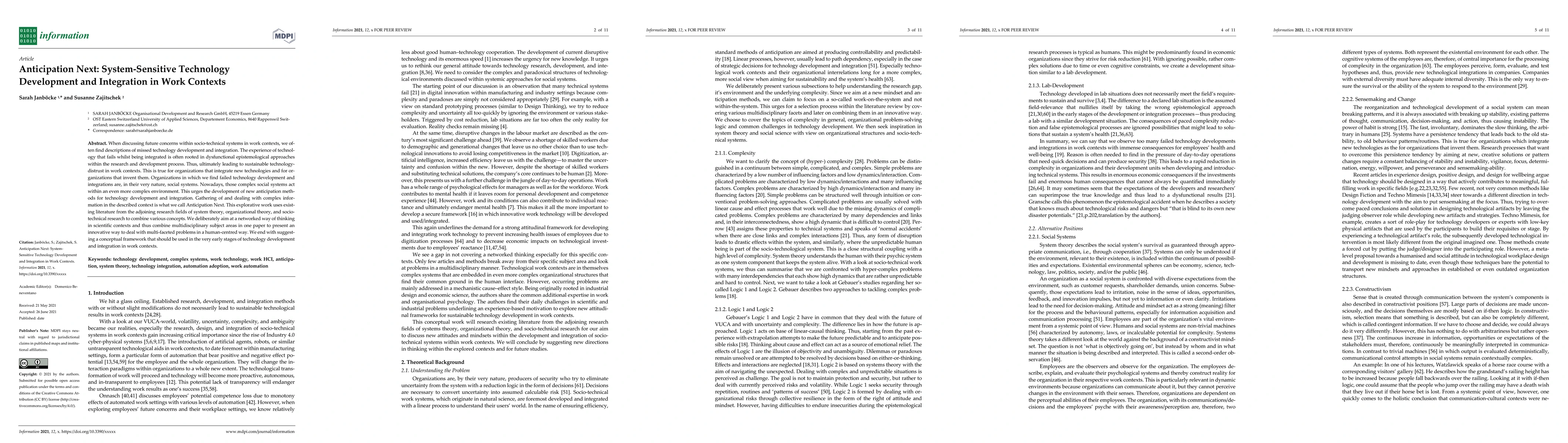 This paper explores the challenges of integrating new technologies in work contexts, emphasizing the need for improved anticipation methods due to frequent failures in technology development. It proposes a conceptual framework combining system theory, organizational theory, and socio-technical research to address complex, multi-faceted problems in a human-centered manner.