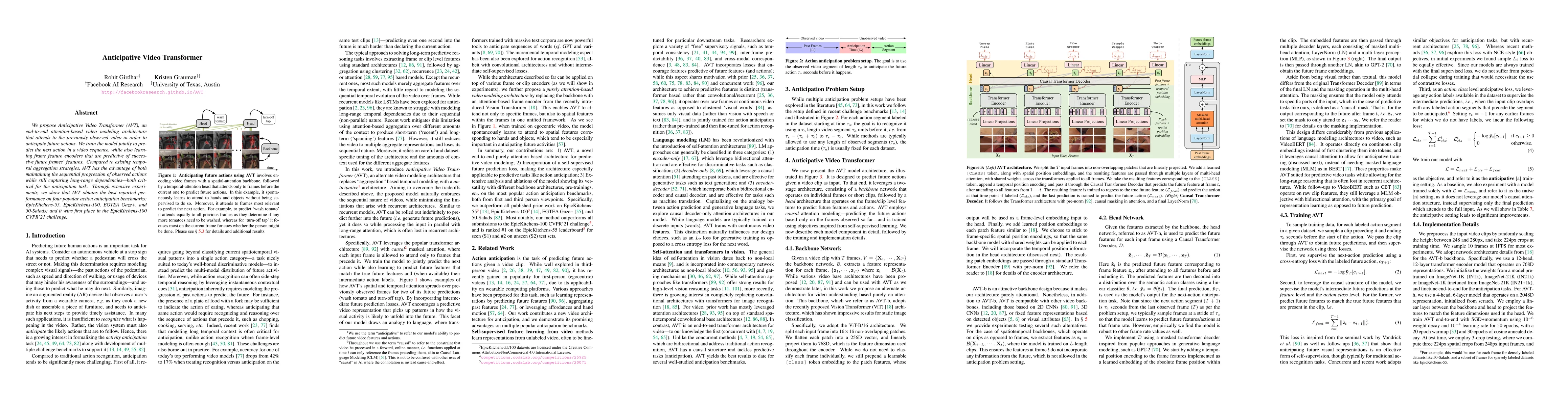 The Anticipative Video Transformer (AVT) is an end-to-end attention-based architecture that predicts future actions in video sequences by attending to previously observed frames. It outperforms existing methods by capturing long-range dependencies while maintaining sequential progression, achieving top results on multiple action anticipation benchmarks.