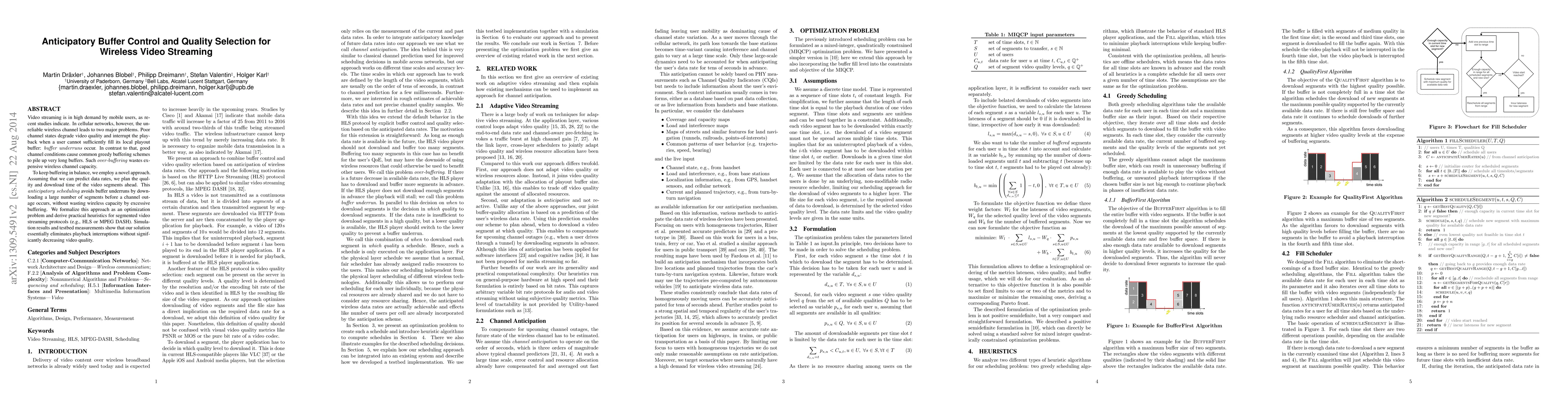 This paper proposes an anticipatory buffer control method to optimize wireless video streaming by predicting data rates and scheduling video segment quality and download times in advance. This approach minimizes buffer underruns and over-buffering, balancing playback quality and efficient use of wireless channel capacity.