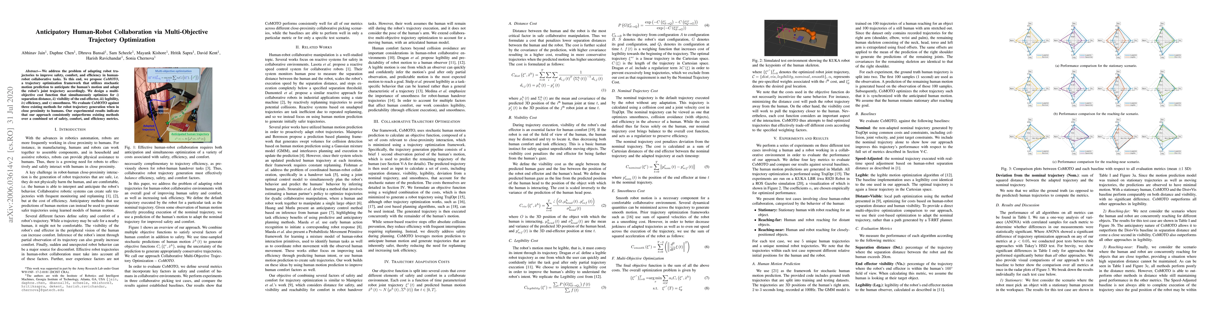 A new framework called CoMOTO optimizes robot trajectories to improve safety, comfort, and efficiency in human-robot collaboration tasks by anticipating human motion and adapting the robot's movement accordingly.
