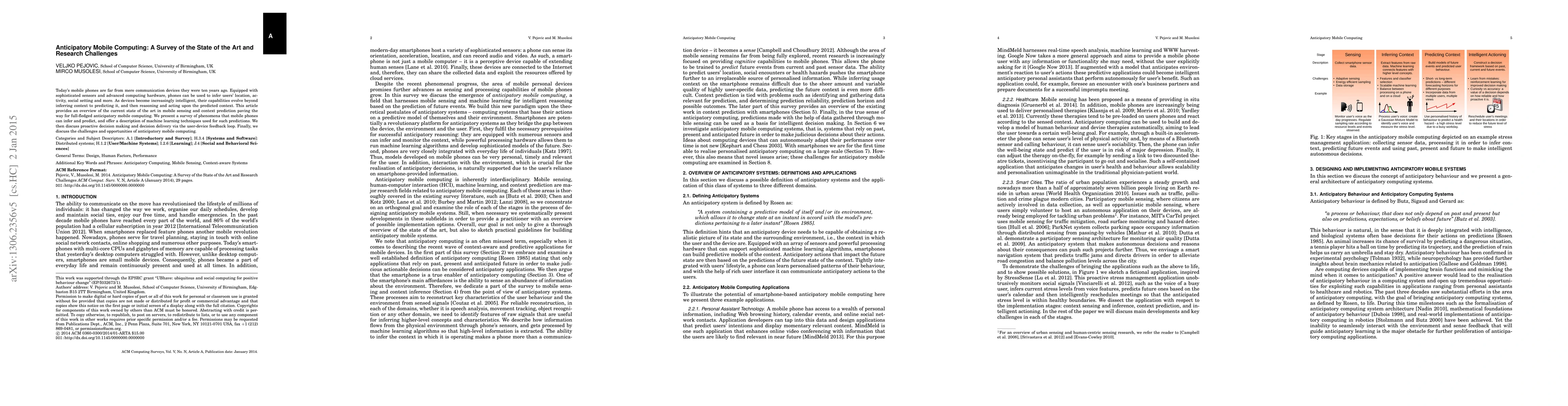 This paper surveys advancements in mobile sensing and context prediction, highlighting how modern mobile devices can infer and predict user context using sophisticated sensors and machine learning. It discusses the potential for proactive decision-making and the challenges and opportunities in developing anticipatory mobile computing.