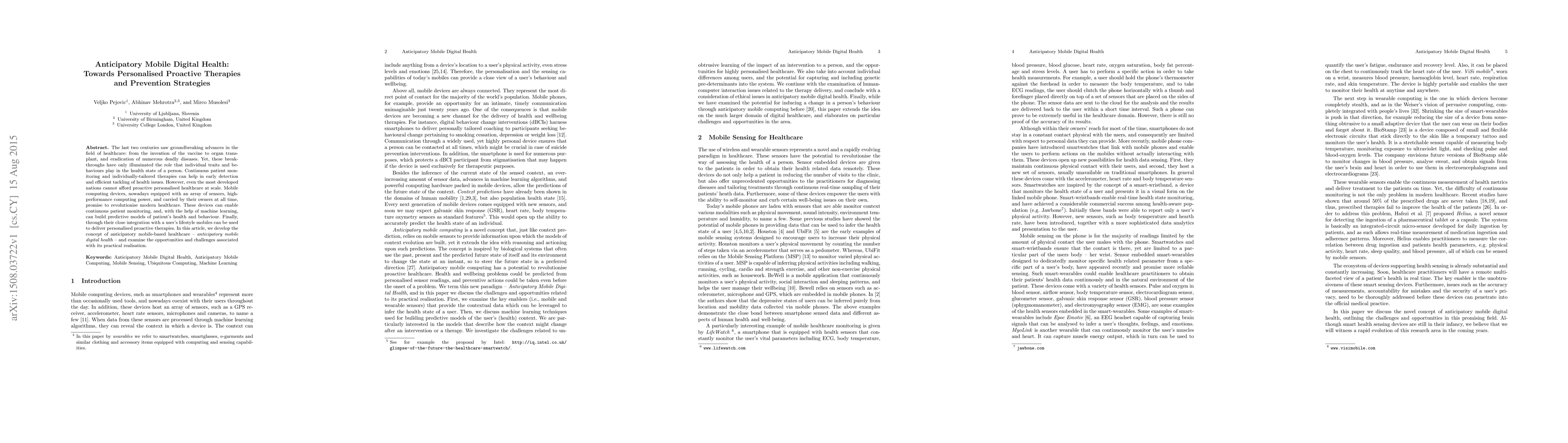 This paper explores the concept of anticipatory mobile digital health, leveraging mobile devices for continuous patient monitoring and personalized proactive therapies using machine learning. It discusses the potential and challenges of implementing such technology for scalable, personalized healthcare.