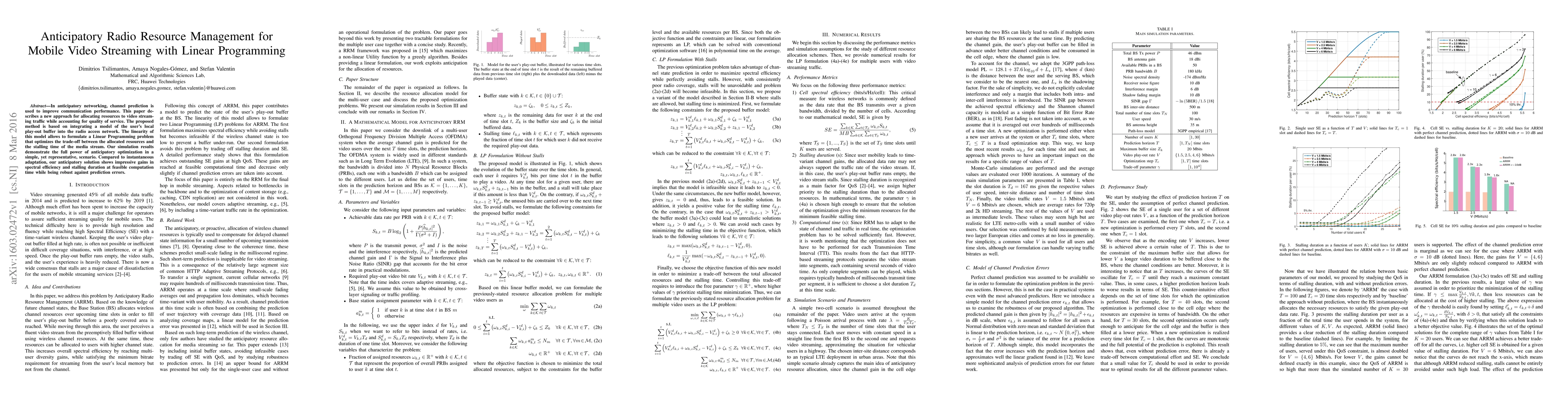 This paper proposes a linear programming approach for anticipatory radio resource management in mobile video streaming, integrating user play-out buffer models to optimize resource allocation. Simulation results show significant gains in spectral efficiency and reduced stalling time compared to instantaneous adaptation, demonstrating the effectiveness of anticipatory optimization.
