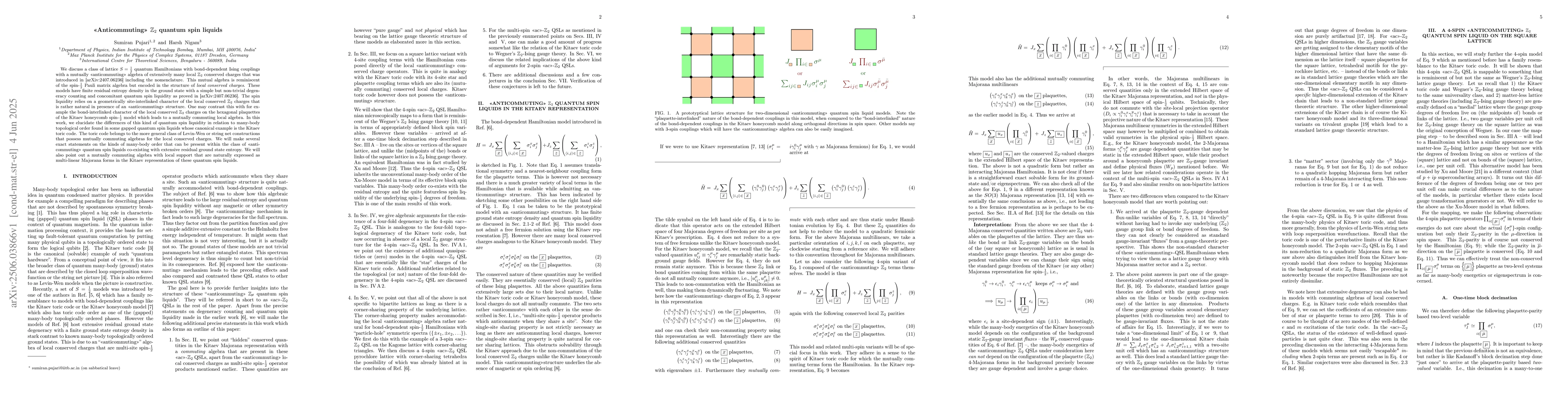 The paper presents a detailed analysis of anticommuting Z2 quantum spin liquids, contrasting them with topological orders and identifying specific many-body orders present in these liquids.