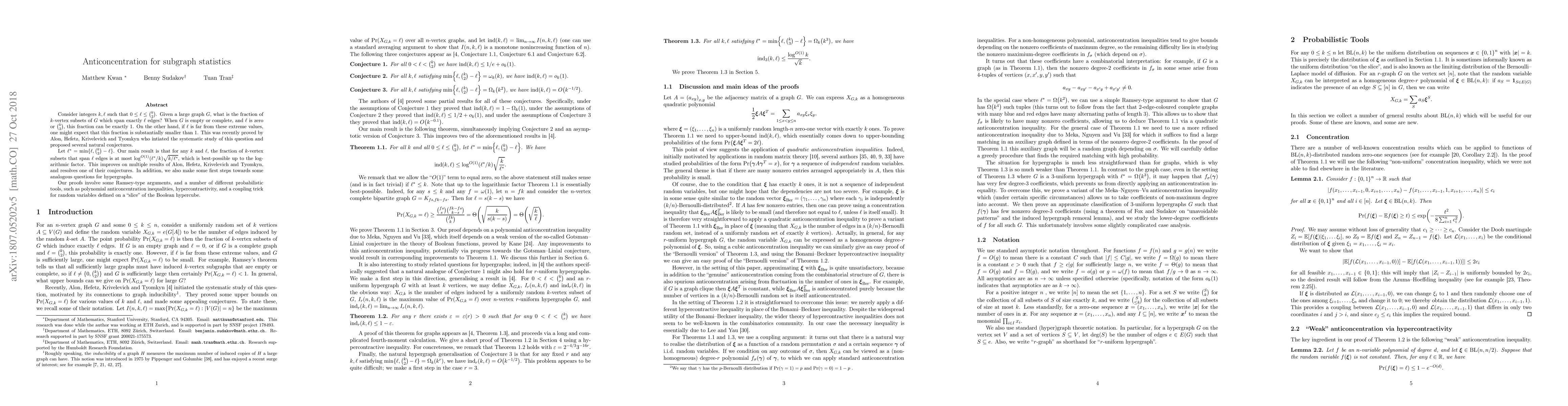 This paper presents a main result that the fraction of k-vertex subsets in a large graph G spanning exactly ell edges is at most u221a(k/ell^*) log^O(1)(ell^*/k), resolving one conjecture of Alon et al. The proof uses Ramsey-type arguments and various probabilistic tools like polynomial anticoncentration inequalities, hypercontractivity, and a coupling trick for random variables on a Boolean hypercube slice.