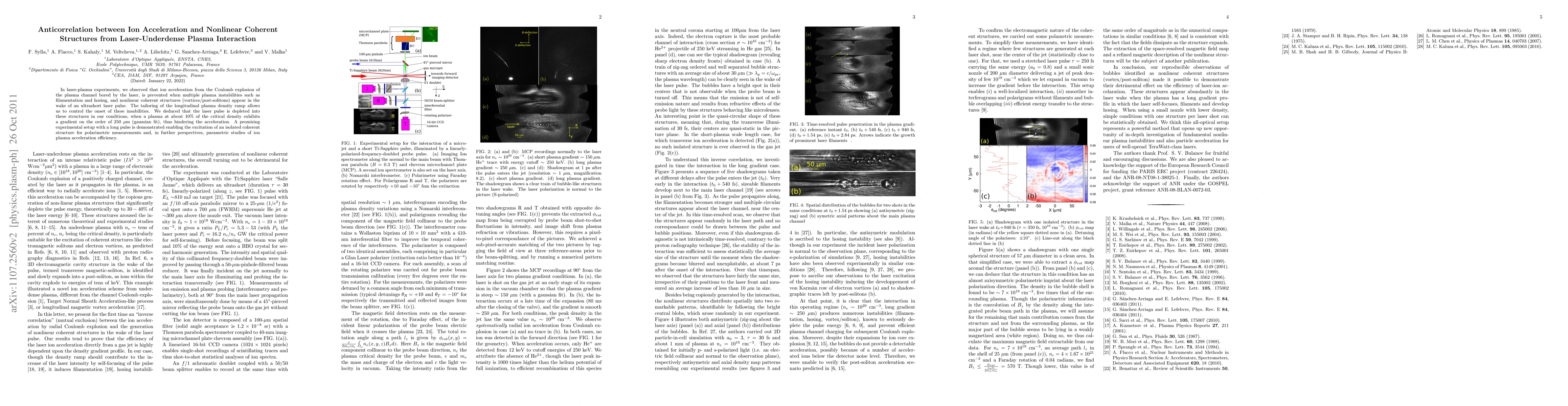 In laser-plasma experiments, we observed that ion acceleration from the Coulomb explosion of the plasma channel bored by the laser, is prevented when multiple plasma instabilities such as filamentation and hosing, and nonlinear coherent structures (vortices/post-solitons) appear in the wake of an ultrashort laser pulse. The tailoring of the longitudinal plasma density ramp allows us to control the onset of these insabilities. We deduced that the laser pulse is depleted into these structures in our conditions, when a plasma at about 10% of the critical density exhibits a gradient on the order of 250 {\mu}m (gaussian fit), thus hindering the acceleration. A promising experimental setup with a long pulse is demonstrated enabling the excitation of an isolated coherent structure for polarimetric measurements and, in further perspectives, parametric studies of ion plasma acceleration efficiency.