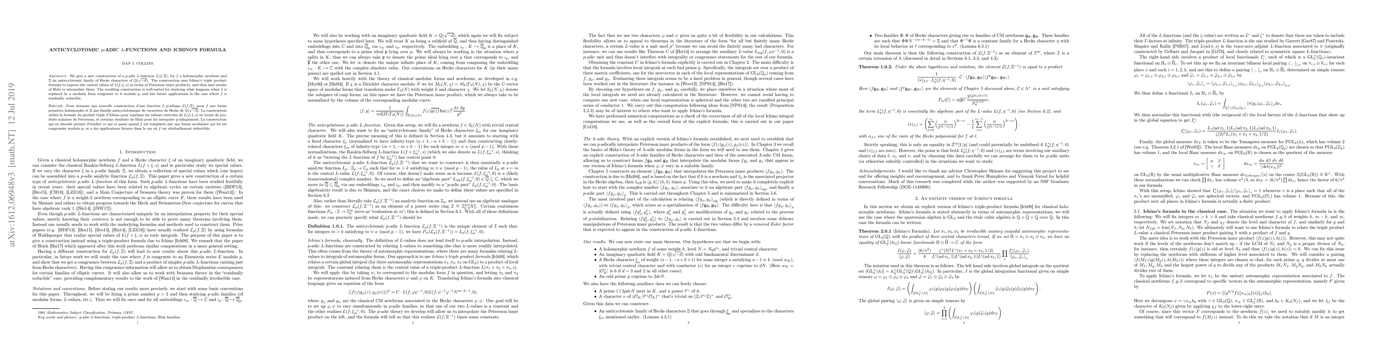 This paper presents a new construction of a $p$-adic $L$-function $\mathcal{L}(f,\Xi)$ for a holomorphic newform $f$ and an anticyclotomic family $\Xi$ using Ichino's triple product formula and Hida's interpolation results, which is particularly useful for studying congruences modulo $p$ and residual reducibility.