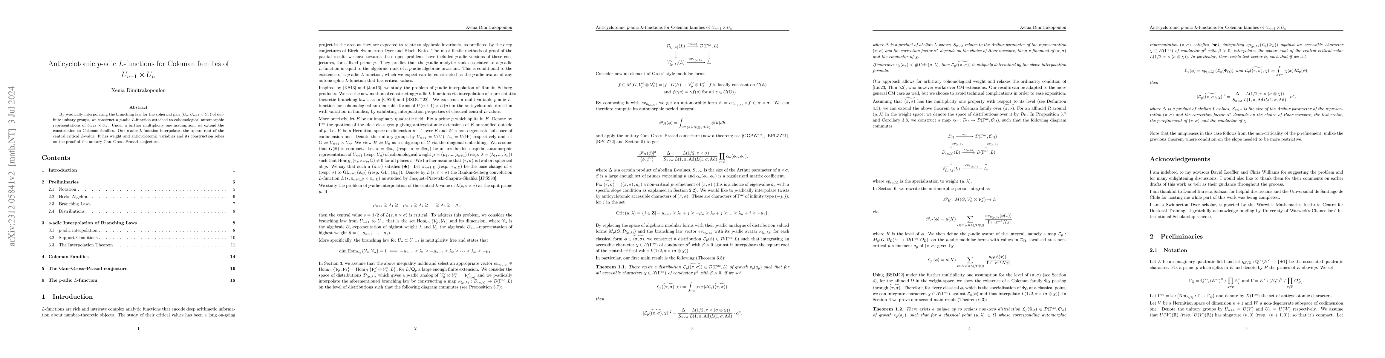By $p$-adically interpolating the branching law for the spherical pair $\left(U_n, U_{n+1} \times U_{n}\right)$ of definite unitary groups, we construct a $p$-adic $L$-function attached to cohomological automorphic representations of $U_{n+1} \times U_{n}$. Under a further multiplicity one assumption, we extend the construction to Coleman families. Our $p$-adic $L$-function interpolates the square root of the central critical $L$-value. It has weight and anticyclotomic variables and its construction relies on the proof of the unitary Gan--Gross--Prasad conjecture.