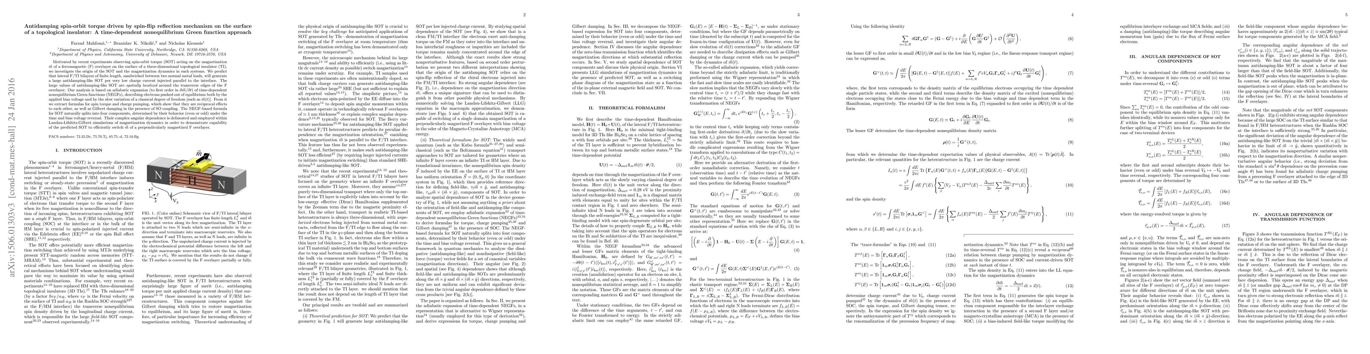 This paper investigates the origin of antidamping spin-orbit torque (SOT) in ferromagnetic (F) overlayers on topological insulator (TI) surfaces, predicting significant SOT generation near the transverse edges of the F overlayer. The study employs time-dependent nonequilibrium Green function approach to derive formulas for spin torque, charge pumping, and Gilbert damping, demonstrating the potential of this SOT to efficiently switch magnetization.