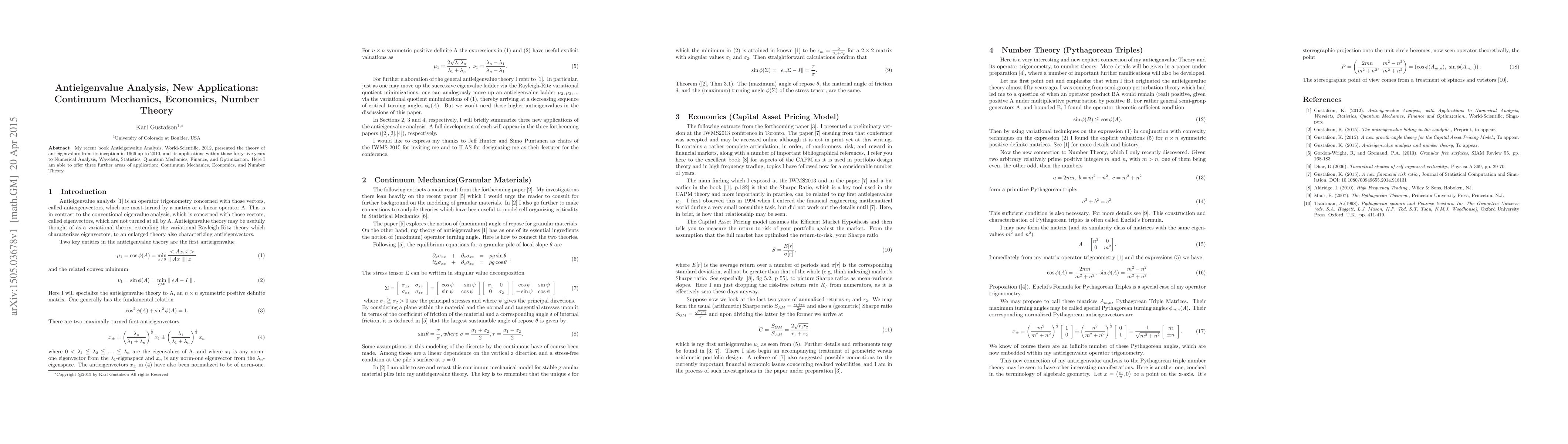 My recent book Antieigenvalue Analysis, World-Scientific, 2012, presented the theory of antieigenvalues from its inception in 1966 up to 2010, and its applications within those forty-five years to Numerical Analysis, Wavelets, Statistics, Quantum Mechanics, Finance, and Optimization. Here I am able to offer three further areas of application: Continuum Mechanics, Economics, and Number Theory.