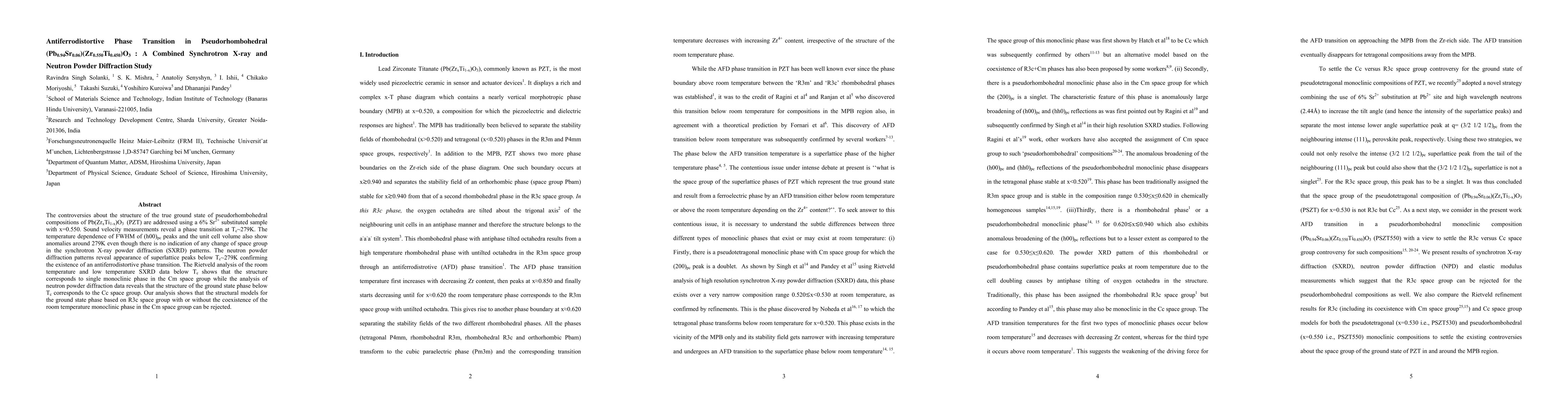 This study investigates the antiferrodistortive phase transition in Pb0.94Sr0.06(Zr0.550Ti0.450)O3 using synchrotron X-ray and neutron powder diffraction. It finds a phase transition at Tc~279K with no change in space group, but neutron diffraction reveals an antiferrodistortive phase transition to the Cc space group, rejecting models based on the R3c space group.