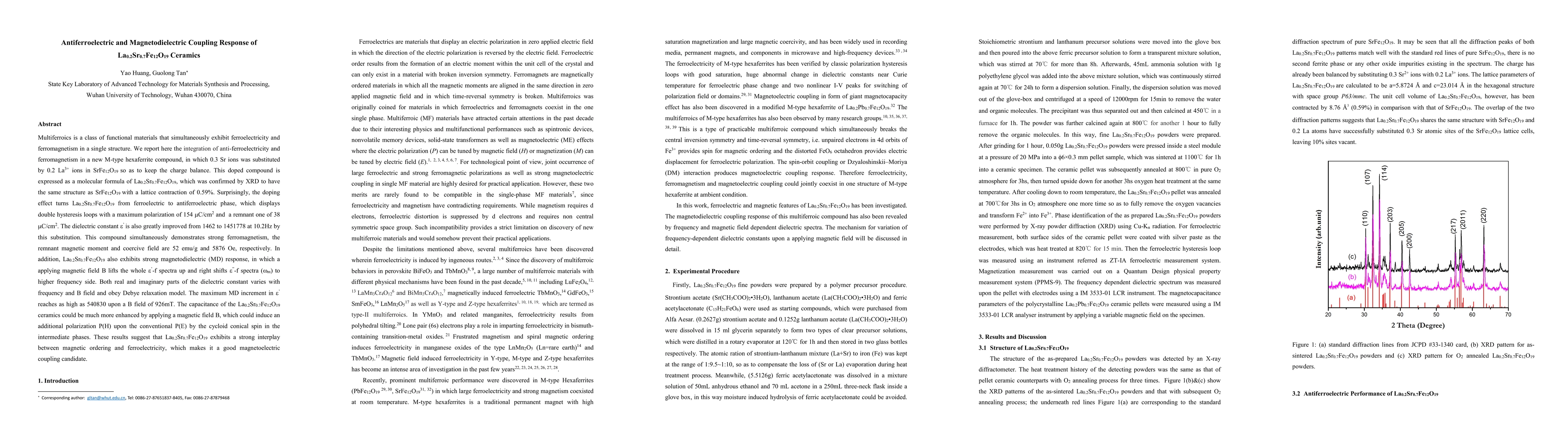 Multiferroics is a class of functional materials that simultaneously exhibit ferroelectricity and ferromagnetism in a single structure. We report here the integration of anti-ferroelectricity and ferromagnetism in a new M-type hexaferrite compound, in which 0.3 Sr ions was substituted by 0.2 La3+ ions in SrFe12O19 so as to keep the charge balance. This doped compound is expressed as a molecular formula of La0.2Sr0.7Fe12O19, which was confirmed by XRD to have the same structure as SrFe12O19 with a lattice contraction of 0.59%. Surprisingly, the doping effect turns La0.2Sr0.7Fe12O19 from ferroelectric to antiferroelectric phase, which displays double hysteresis loops with a maximum polarization of 154 uC/cm2 and a remnant one of 38uC/cm2. The dielectric constant is also greatly improved from 1462 to 1451778 at 10.2Hz by this substitution. This compound simultaneously demonstrates strong ferromagnetism, the remnant magnetic moment and coercive field are 52 emu/g and 5876 Oe, respectively. In addition, La0.2Sr0.7Fe12O19 also exhibits strong magnetodielectric (MD) response, in which a applying magnetic field B lifts the whole e1-f spectra up and right shifts e2-f spectra to higher frequency side. Both real and imaginary parts of the dielectric constant varies with frequency and B field and obey Debye relaxation model. The maximum MD increment in e1 reaches as high as 540830 upon a B field of 926mT. The capacitance of the La0.2Sr0.7Fe12O19 ceramics could be much more enhanced by applying a magnetic field B, which could induce an additional polarization P(H) upon the conventional P(E) by the cycloid conical spin in the intermediate phases. These results suggest that La0.2Sr0.7Fe12O19 exhibits a strong interplay between magnetic ordering and ferroelectricity, which makes it a good magnetoelectric coupling candidate.