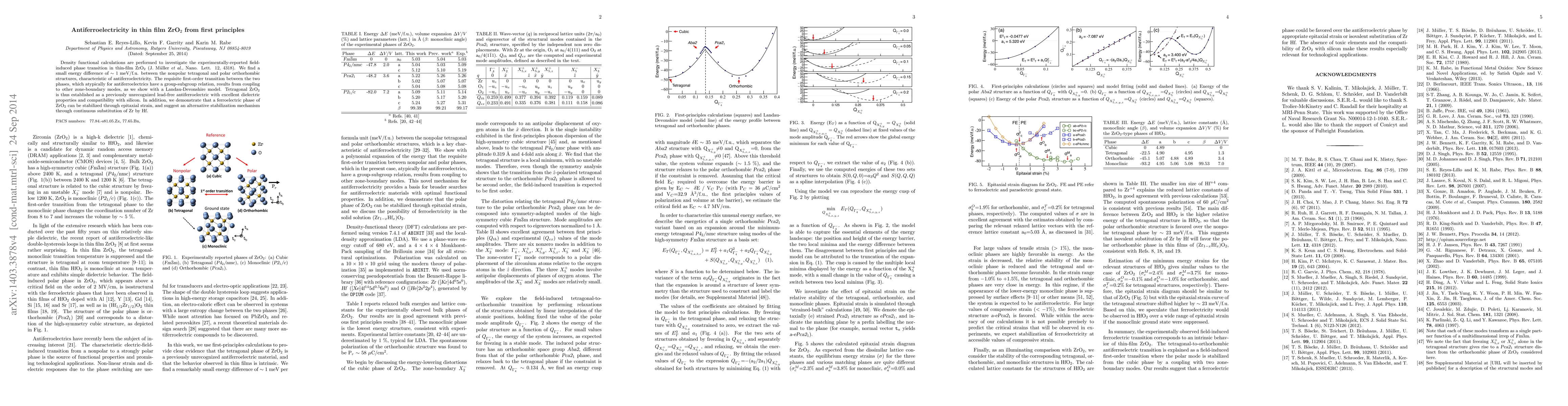 This study uses density functional calculations to confirm the antiferroelectric behavior in thin-film ZrO2, revealing a small energy difference between its nonpolar tetragonal and polar orthorhombic phases. The transition is driven by coupling to other modes, and ZrO2 is identified as a lead-free antiferroelectric with potential for silicon compatibility.