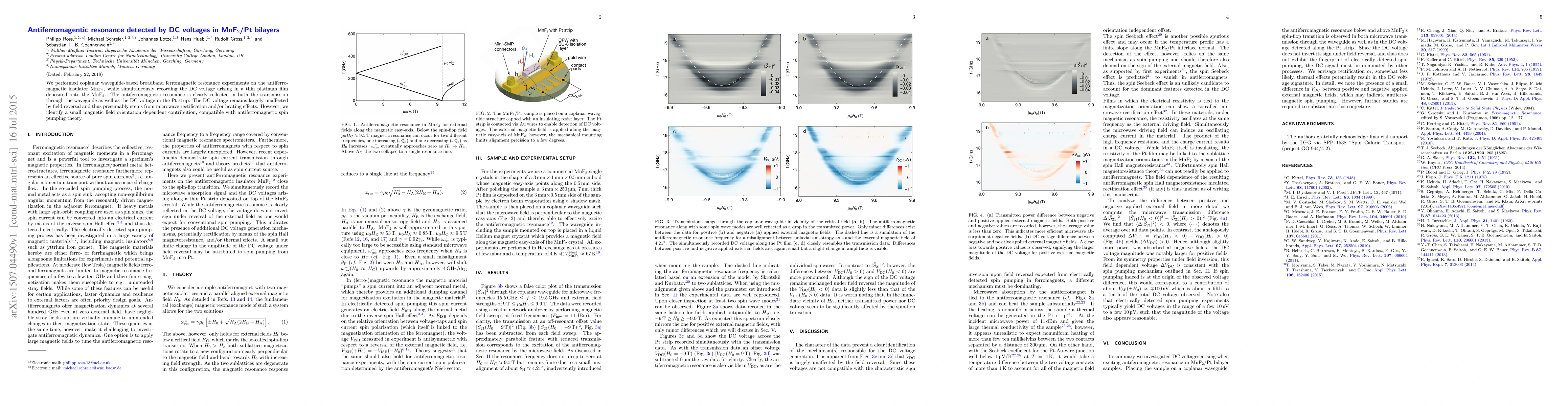 The paper reports on a study using coplanar waveguide experiments to detect antiferromagnetic resonance in MnF2, an antiferromagnetic insulator. The resonance was observed both in transmission through the waveguide and in DC voltage in a Pt film on MnF2. The DC voltage, largely from rectification or heating, shows a minor magnetic field-dependent component, suggesting antiferromagnetic spin pumping.