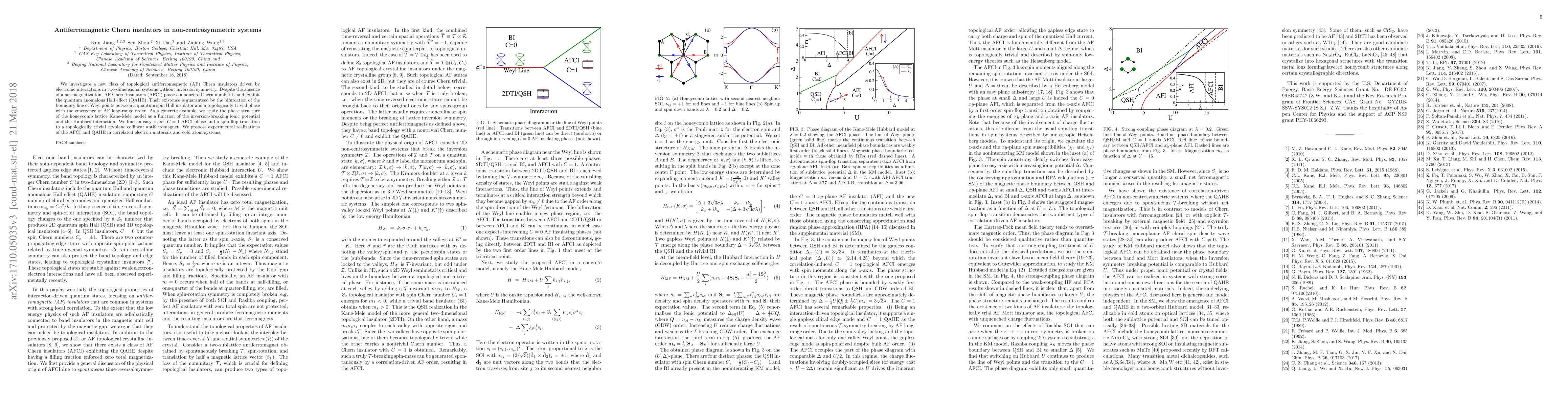 This paper explores a novel class of topological antiferromagnetic Chern insulators in two-dimensional non-centrosymmetric systems, characterized by a nonzero Chern number and exhibiting the quantum anomalous Hall effect, with potential experimental realizations in correlated electron materials and cold atom systems. The study specifically examines the phase structure of the Kane-Mele model under inversion-breaking conditions and Hubbard interactions.