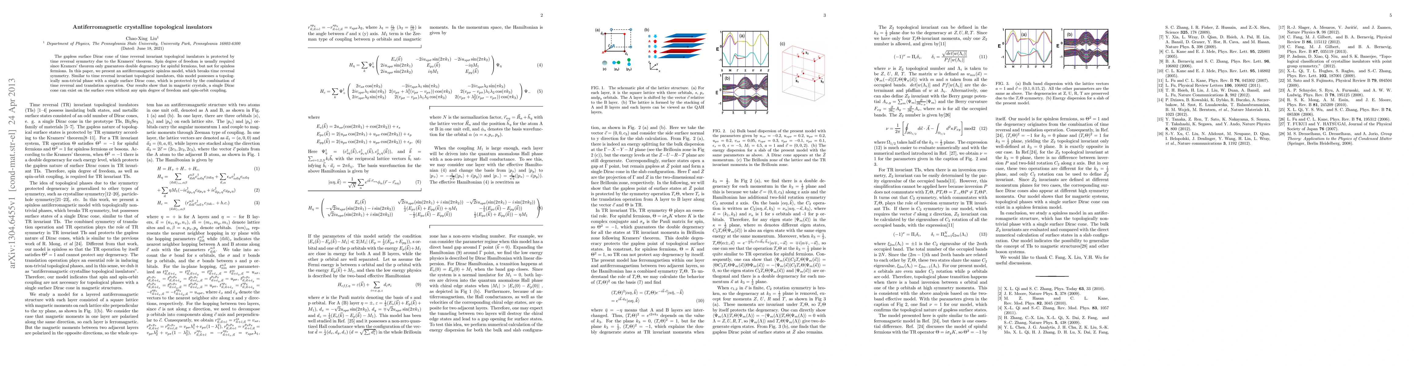 The gapless surface Dirac cone of time reversal invariant topological insulators is protected by time reversal symmetry due to the Kramers' theorem. Spin degree of freedom is usually required since Kramers' theorem only guarantees double degeneracy for spinful fermions, but not for spinless fermions. In this paper, we present an antiferromagnetic spinless model, which breaks time reversal symmetry. Similar to time reversal invariant topological insulators, this model possesses a topologically non-trivial phase with a single surface Dirac cone, which is protected by the combination of time reversal and translation operation. Our results show that in magnetic crystals, a single Dirac cone can exist on the surface even without any spin degree of freedom and spin-orbit coupling.