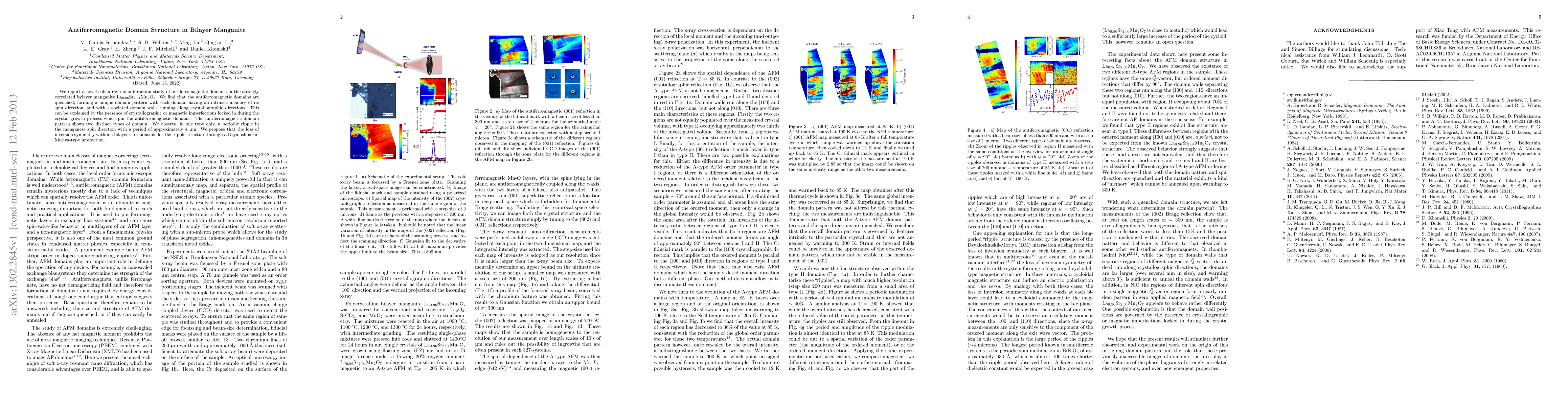 We report a novel soft x-ray nanodiffraction study of antiferromagnetic domains in the strongly correlated bylayer manganite La$_{0.96}$Sr$_{2.04}$Mn$_{2}$O$_{7}$. We find that the antiferromagnetic domains are quenched, forming a unique domain pattern with each domain having an intrinsic memory of its spin direction, and with associated domain walls running along crystallographic directions. This can be explained by the presence of crystallographic or magnetic imperfections locked in during the crystal growth process which pin the antiferromagnetic domains. The antiferromagnetic domain pattern shows two distinct types of domain. We observe, in one type only, a periodic ripple in the manganese spin direction with a period of approximately 4 \micro\meter. We propose that the loss of inversion symmetry within a bilayer is responsible for this ripple structure through a Dzyaloshinskii-Moriya-type interaction.