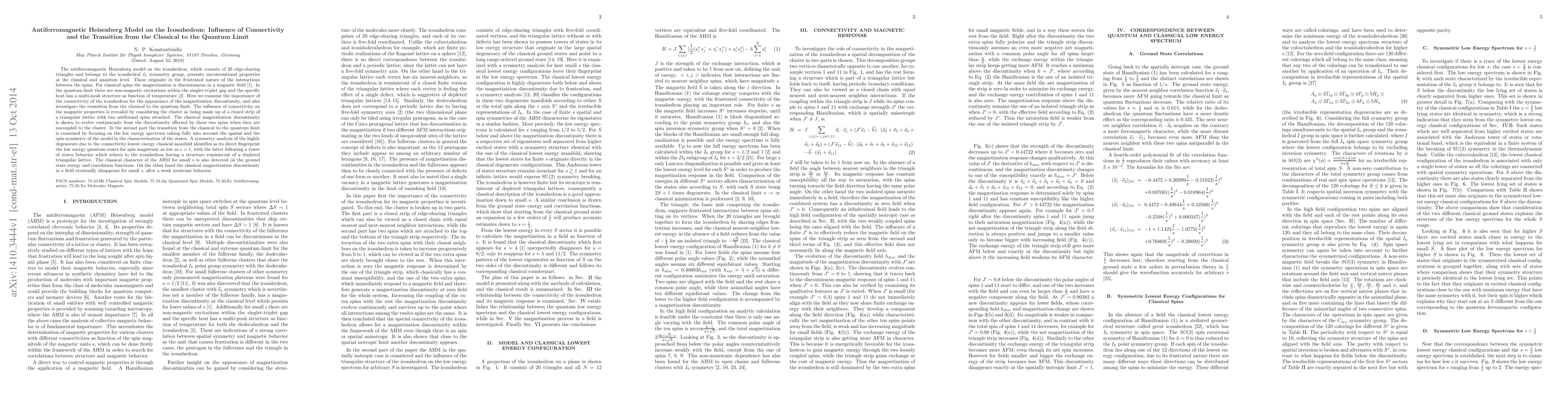The antiferromagnetic Heisenberg model on the icosahedron, which consists of 20 edge-sharing triangles and belongs to the icosahedral $I_h$ symmetry group, presents unconventional properties at the classical and quantum level. These originate in the frustrated nature of the interactions between the spins. For classical spins the magnetization is discontinuous in a magnetic field. Here we examine the importance of the connectivity of the icosahedron for the appearance of the magnetization discontinuity, and also investigate the transition from the classical to the quantum limit. The influence of connectivity on the magnetic properties is revealed by considering the cluster as being made up of a closed strip of a triangular lattice with two additional spins attached. The classical magnetization discontinuity is shown to evolve continuously from the discontinuity effected by these two spins when they are uncoupled to the cluster. In the second part the transition from the classical to the quantum limit is examined by focusing on the low energy spectrum taking fully into account the spatial and the spin symmetry of the model in the characterization of the states. A symmetry analysis of the highly degenerate due to the connectivity lowest energy classical manifold identifies as its direct fingerprint the low energy quantum states for spin magnitude as low as $s=1$, with the latter following a tower of states behavior which relates to the icosahedron having a structure reminiscent of a depleted triangular lattice. The classical character of the AHM for small $s$ is also detected on the ground state energy and correlation functions. On the other hand the classical magnetization discontinuity in a field eventually disappears for small $s$, after a weak reentrant behavior.