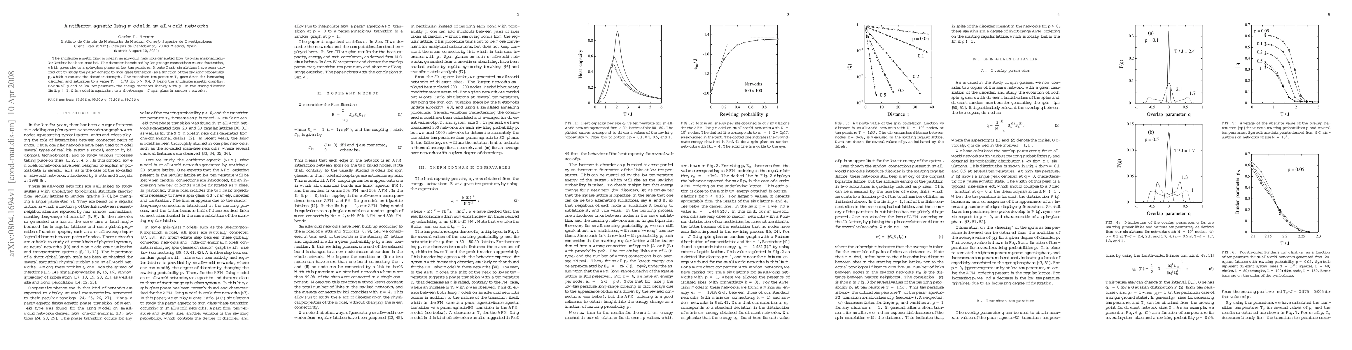 This study investigates the antiferromagnetic Ising model in small-world networks derived from regular lattices, showing that long-range connections lead to a spin-glass phase at low temperatures. Monte Carlo simulations reveal a decreasing transition temperature Tc with increasing disorder, saturating at Tc ~ 1.7 J for high disorder.
