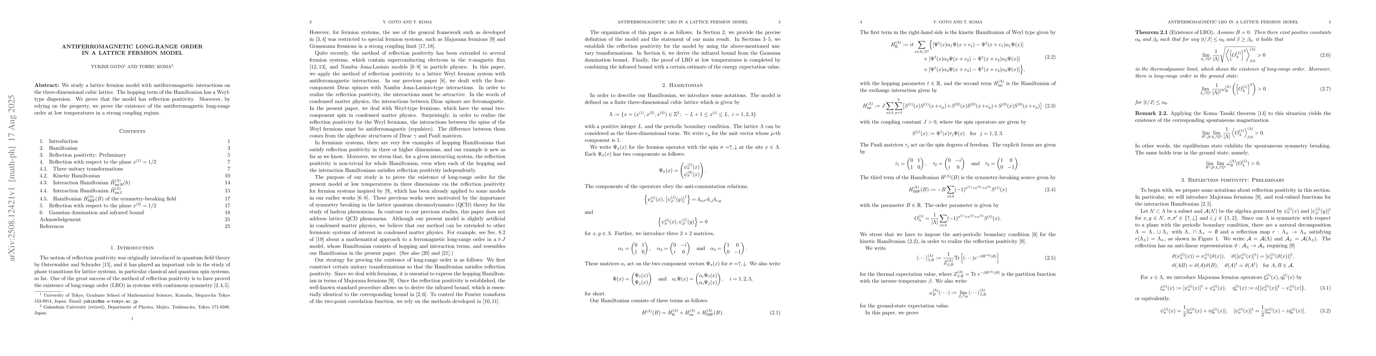 We study a lattice fermion model with antiferromagnetic interactions on the three-dimensional cubic lattice. The hopping term of the Hamiltonian has a Weyl-type dispersion. We prove that the model has reflection positivity. Moreover, by relying on the property, we prove the existence of the antiferromagnetic long-range order at low temperatures in a strong coupling regime.
