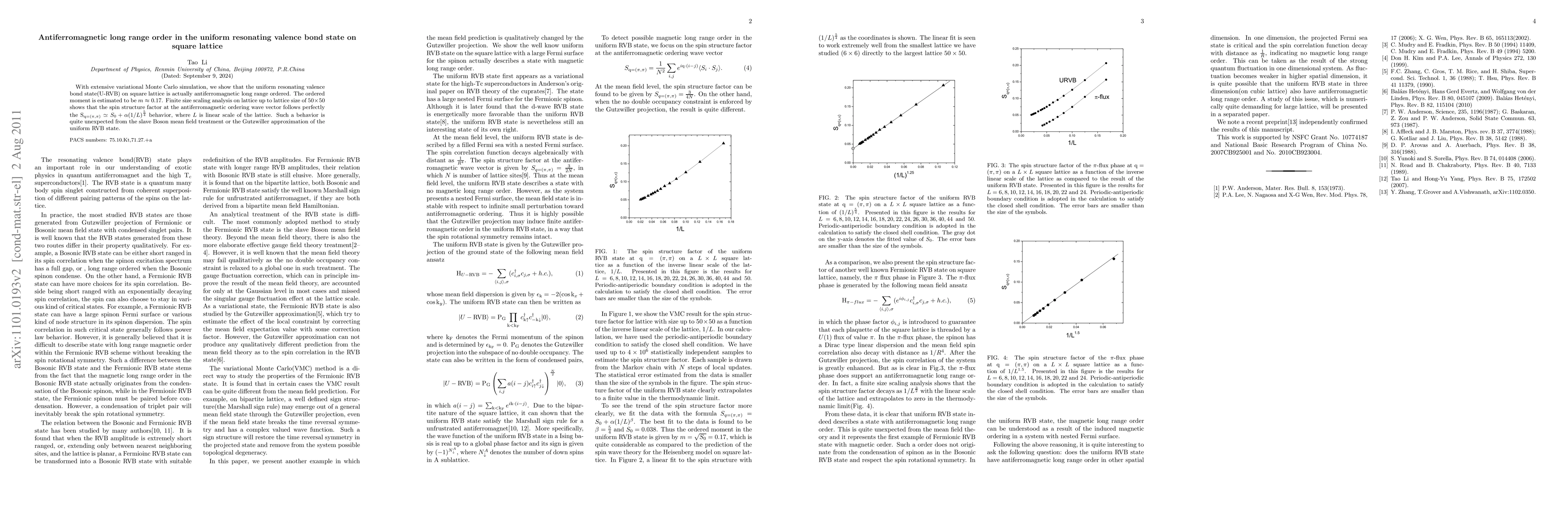 This paper demonstrates through extensive variational Monte Carlo simulations that the uniform resonating valence bond state on a square lattice exhibits antiferromagnetic long-range order, with an estimated ordered moment of $m\approx 0.17$. Finite size scaling analysis confirms this order, defying predictions from slave Boson mean field treatment and Gutzwiller approximation.