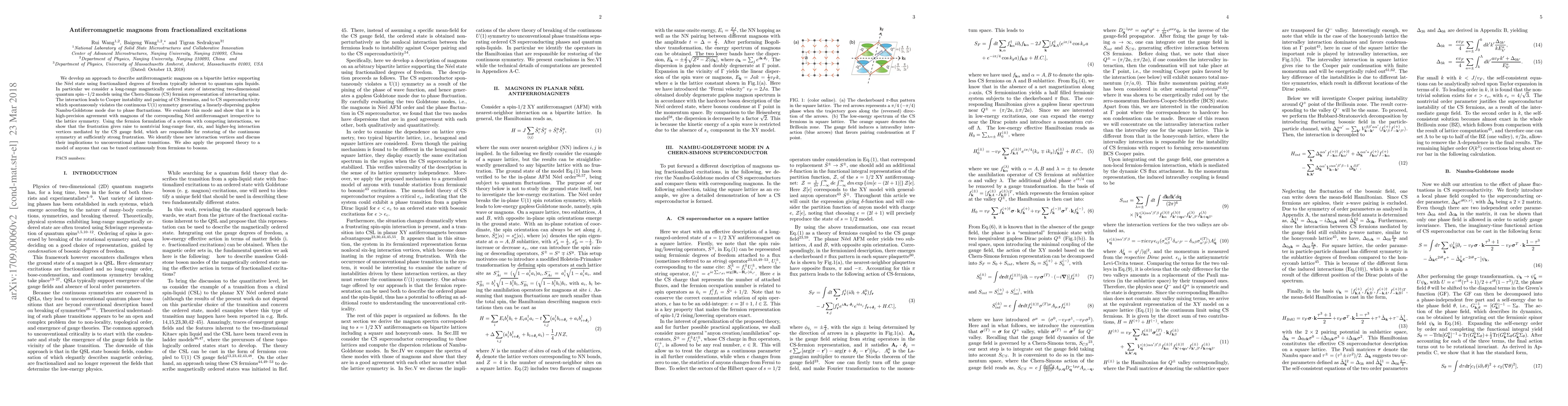 This research introduces a novel method to describe antiferromagnetic magnons using fractionalized degrees of freedom, typically associated with quantum spin liquids. It demonstrates that interaction-induced Cooper pairing in CS fermions generates a Nambu-Goldstone mode matching antiferromagnetic magnons, irrespective of lattice symmetry. The study also identifies new interaction vertices due to frustration, which could influence unconventional phase transitions, and applies the theory to a model of anyons transitioning from fermions to bosons.